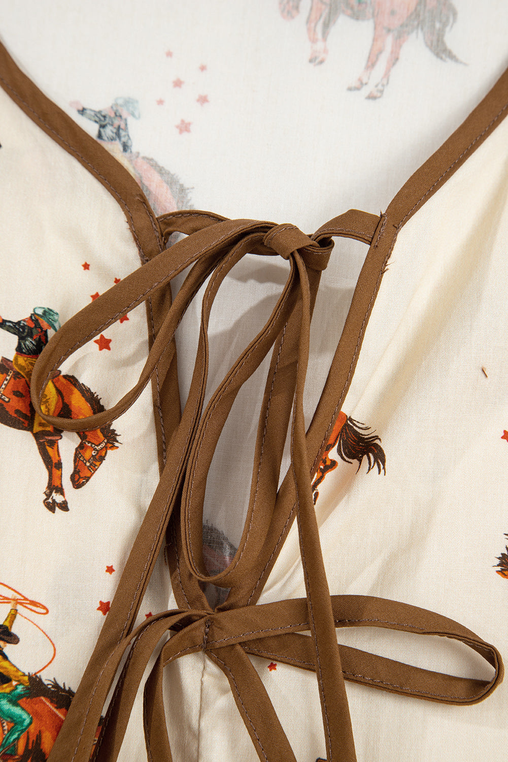 Apricot Cowboy Print Puff Sleeve Bowknot Peplum Blouse