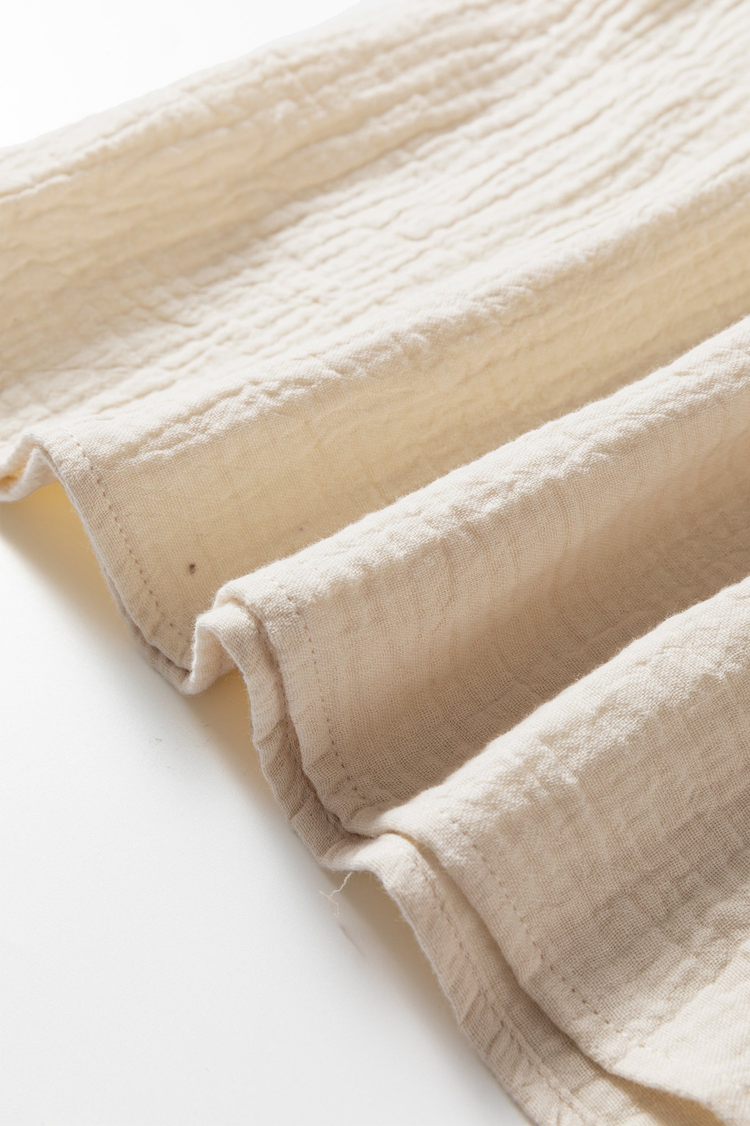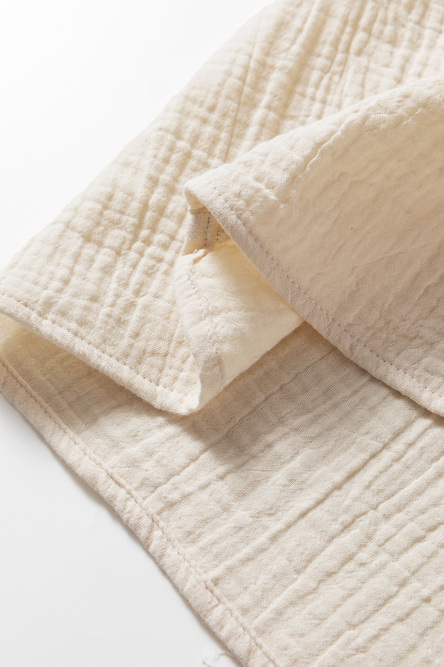 Beige Crochet Insert Textured Cotton Short Sleeve Blouse Top