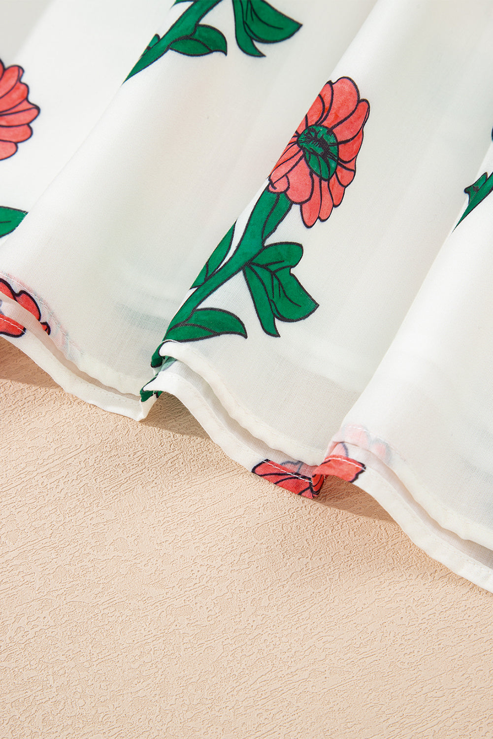 Beige Floral Print Shirred Split Neck Short Sleeve Blouse