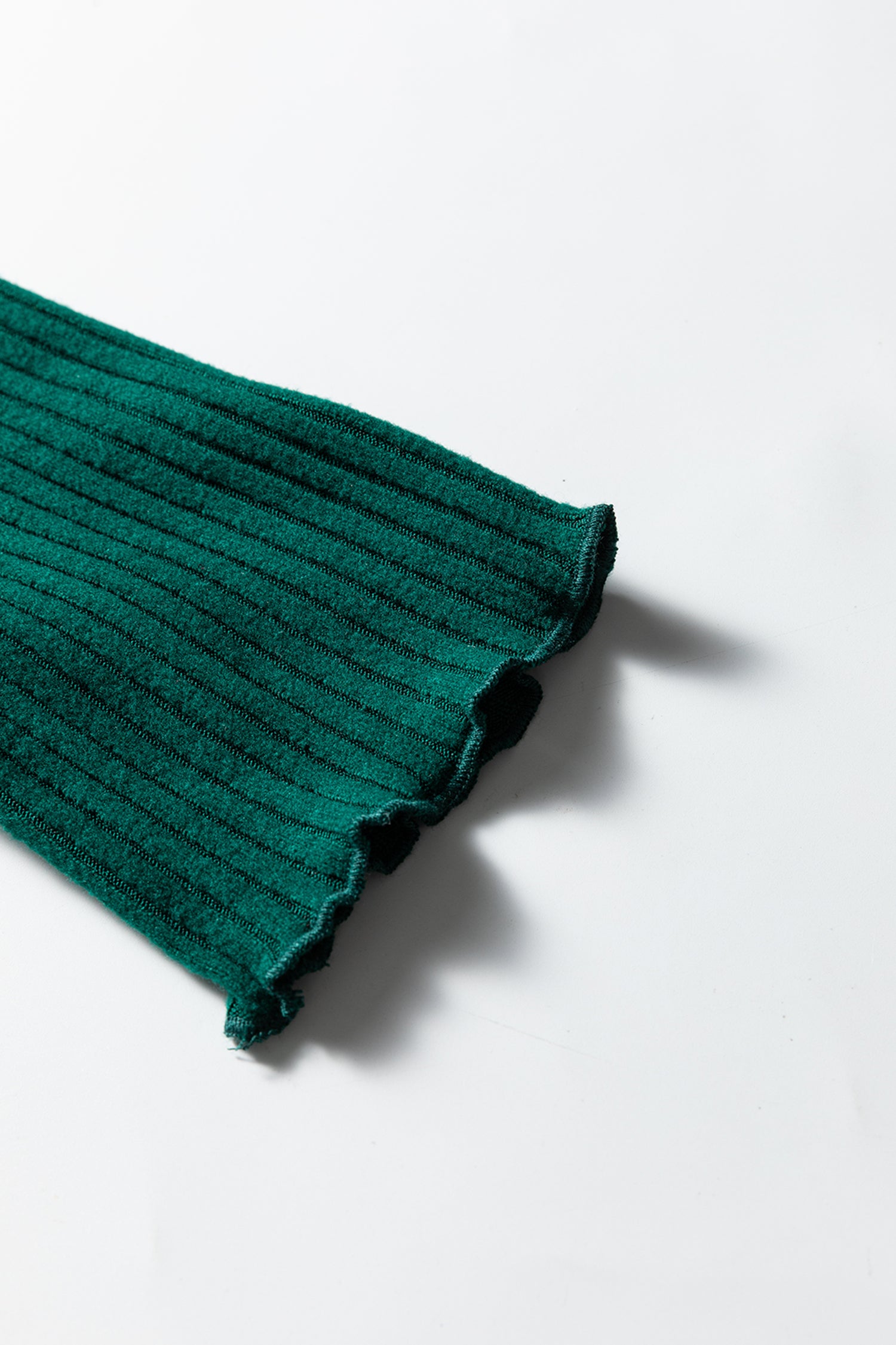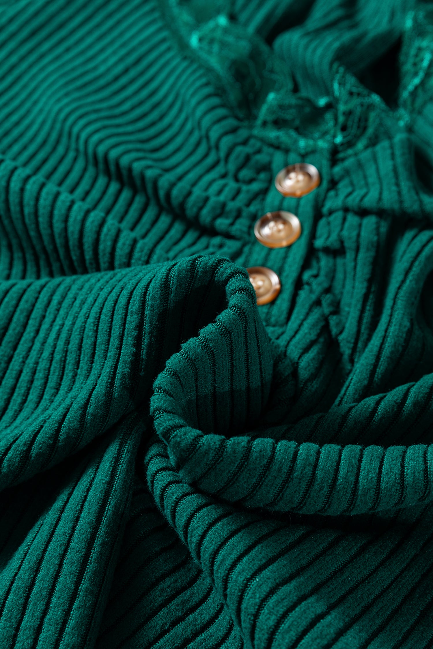 Beige Lace Neckline Button Decor Lettuce Edge Long Sleeve Ribbed Top
