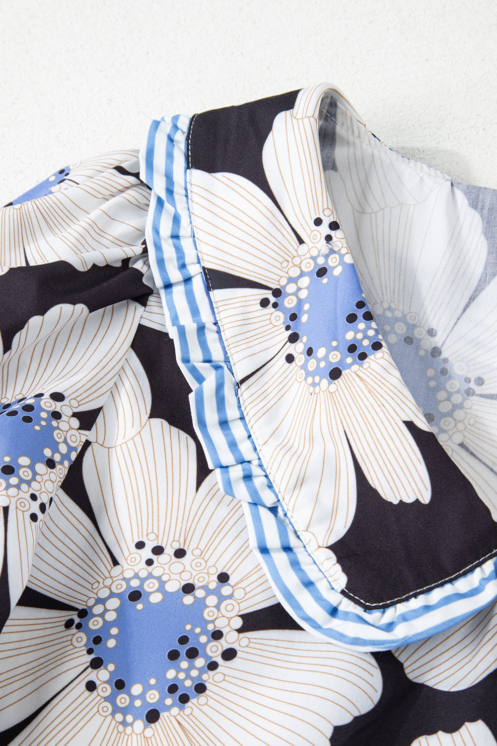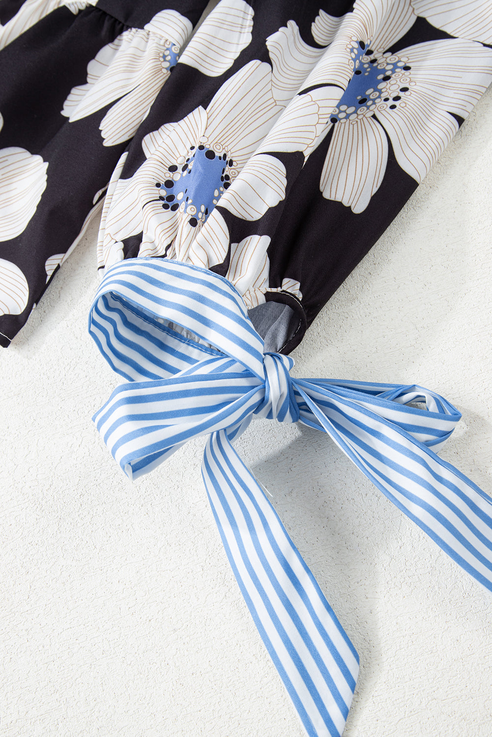 Black Floral Print Striped Tie Sleeve Collared V Neck Blouse