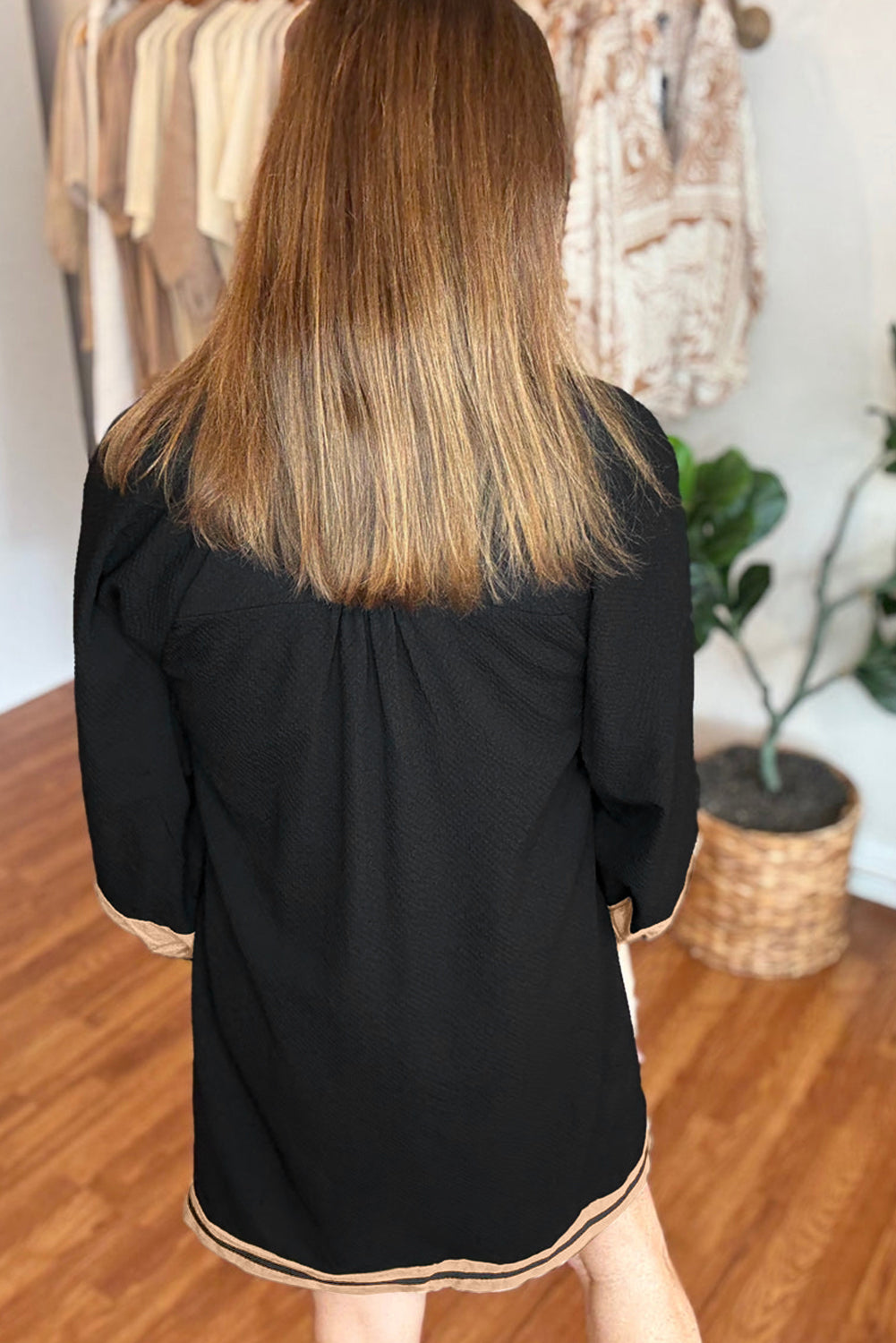 Black Plus Size Color Block Striped Trim V Neck Long Sleeve Shift Mini Dress