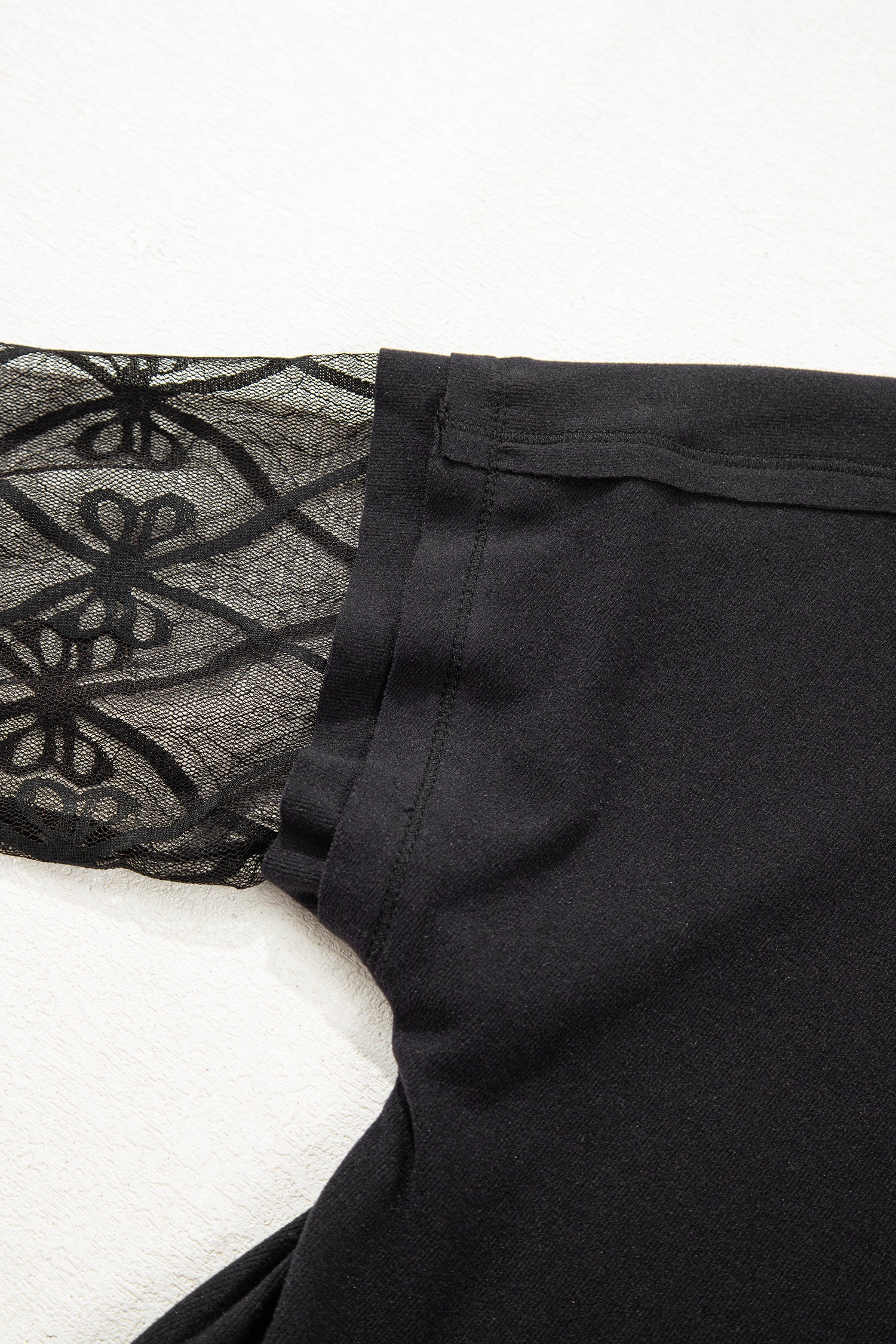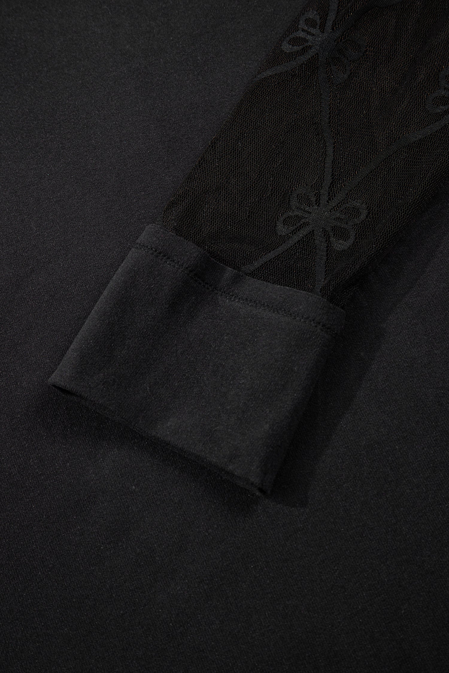 Black Solid Color Bow Textured Patchwork Long Sleeve Tee