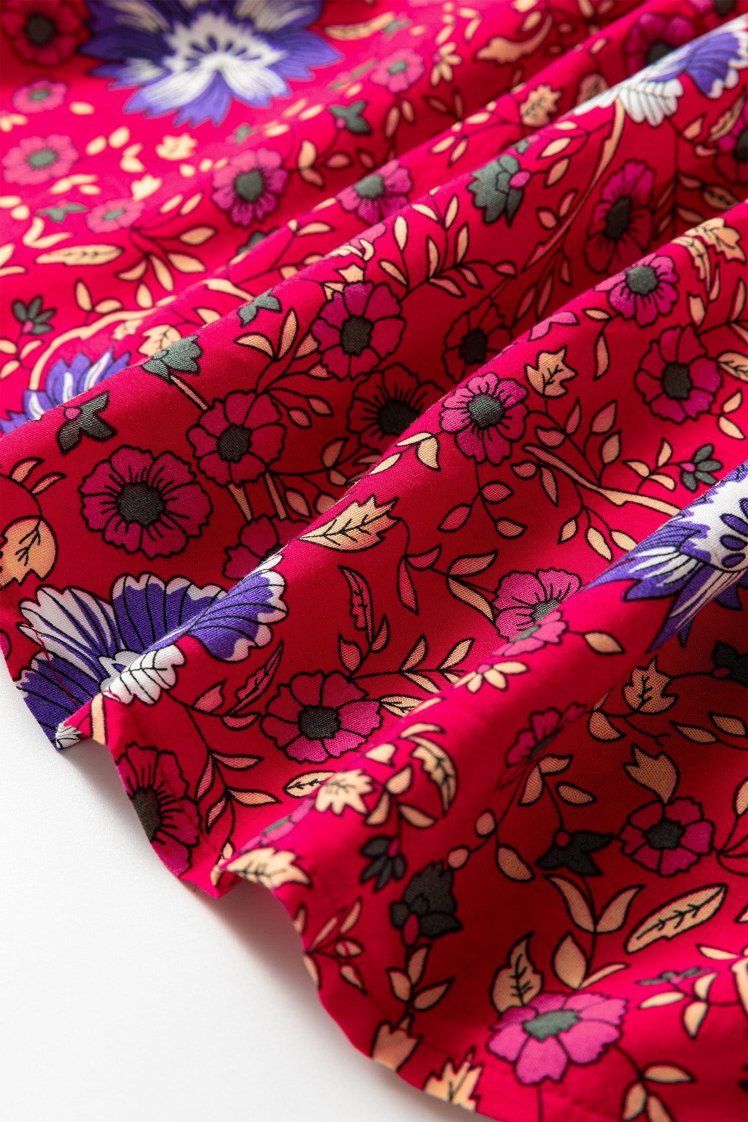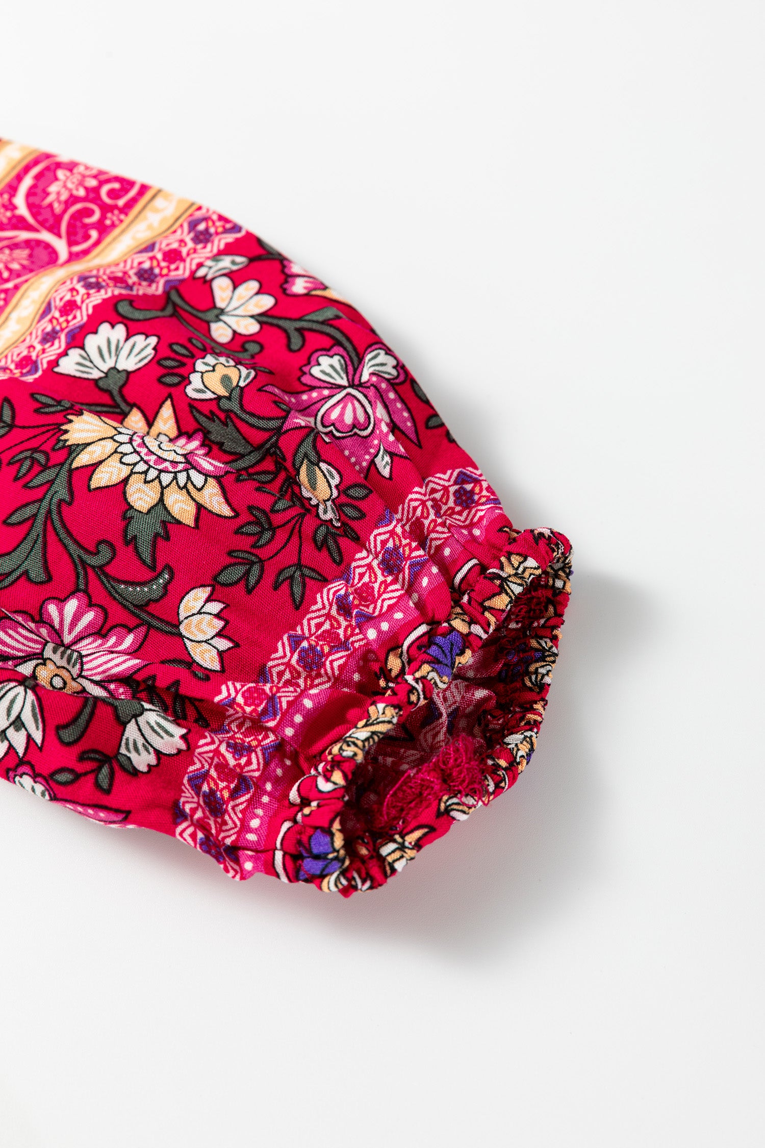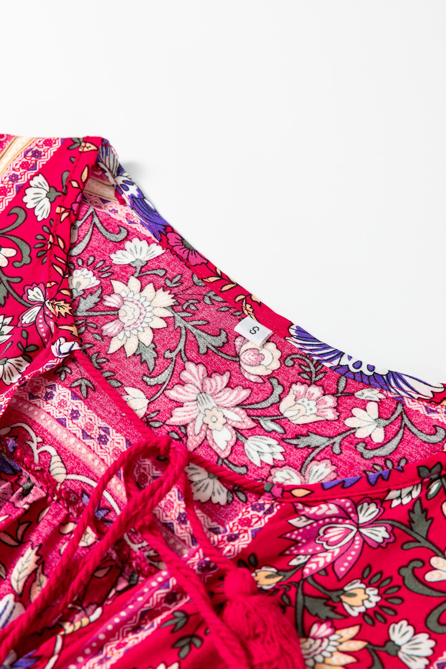 Blue Bohemian Floral Print Tassel Tie Front Long Sleeve Blouse