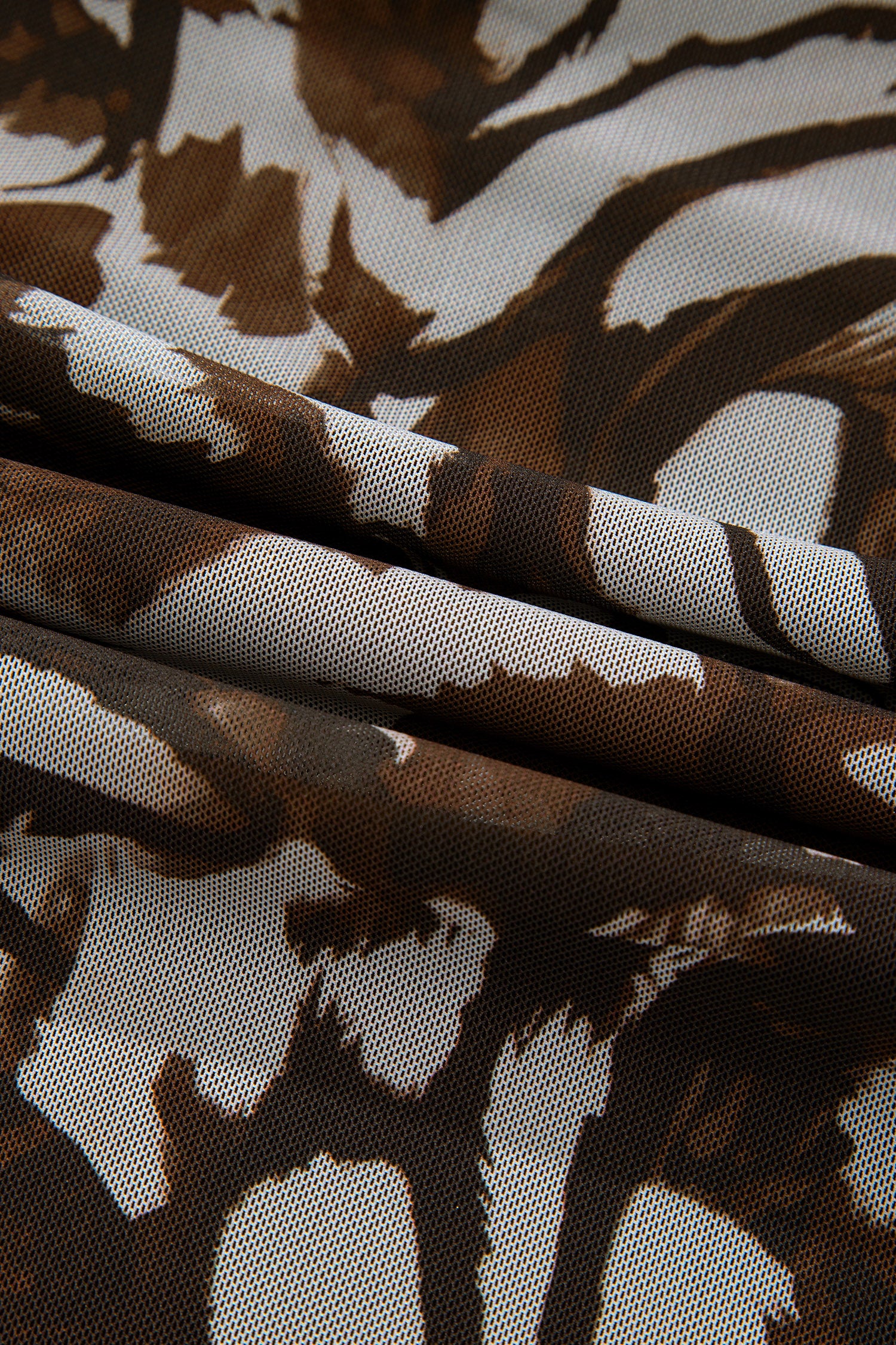 Brown Abstract Print Mesh Cowl Neck Cap Sleeve Ruched Midi Dress with Slit