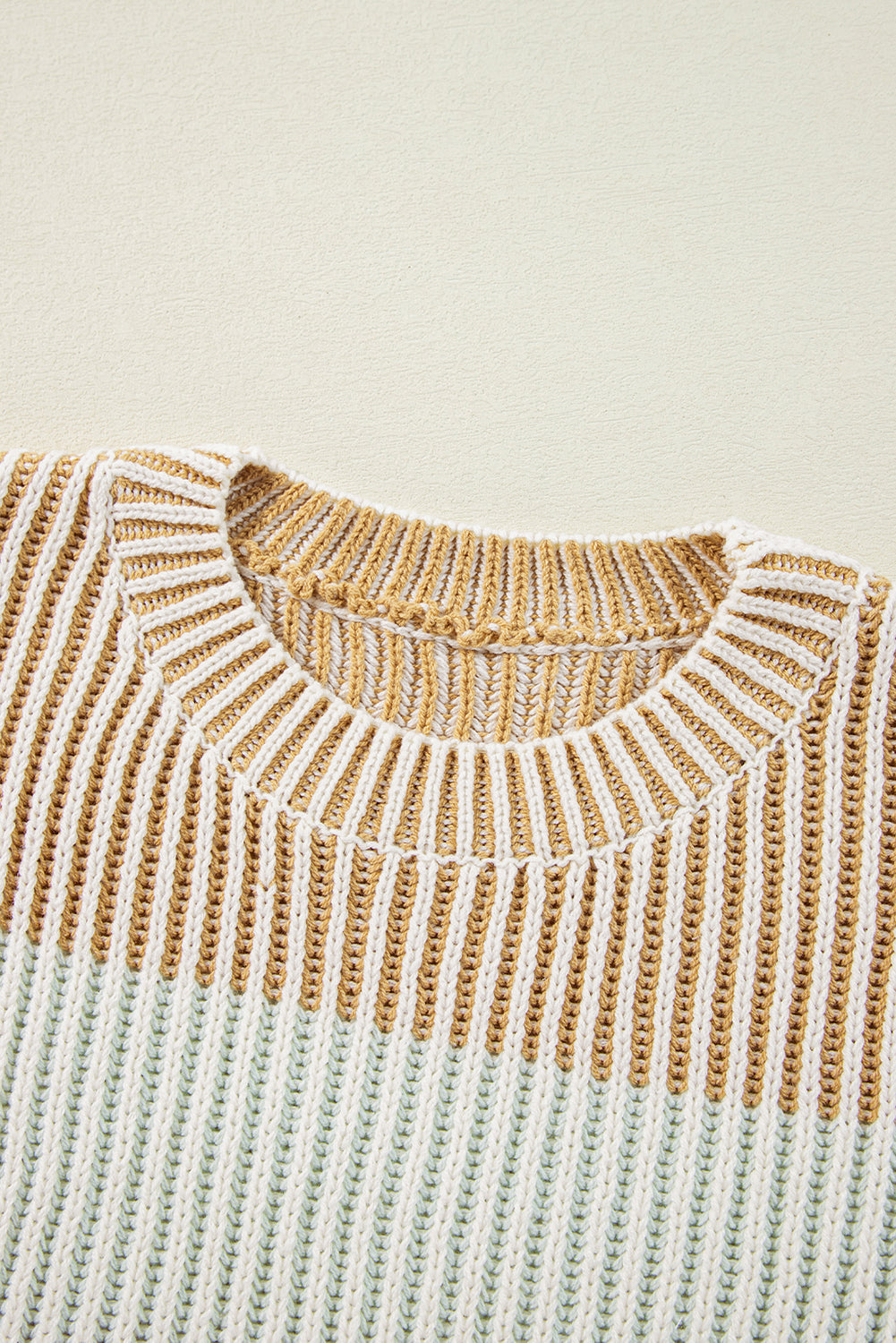 Brown Colorblock Textured Knit Bubble Sleeve Sweater