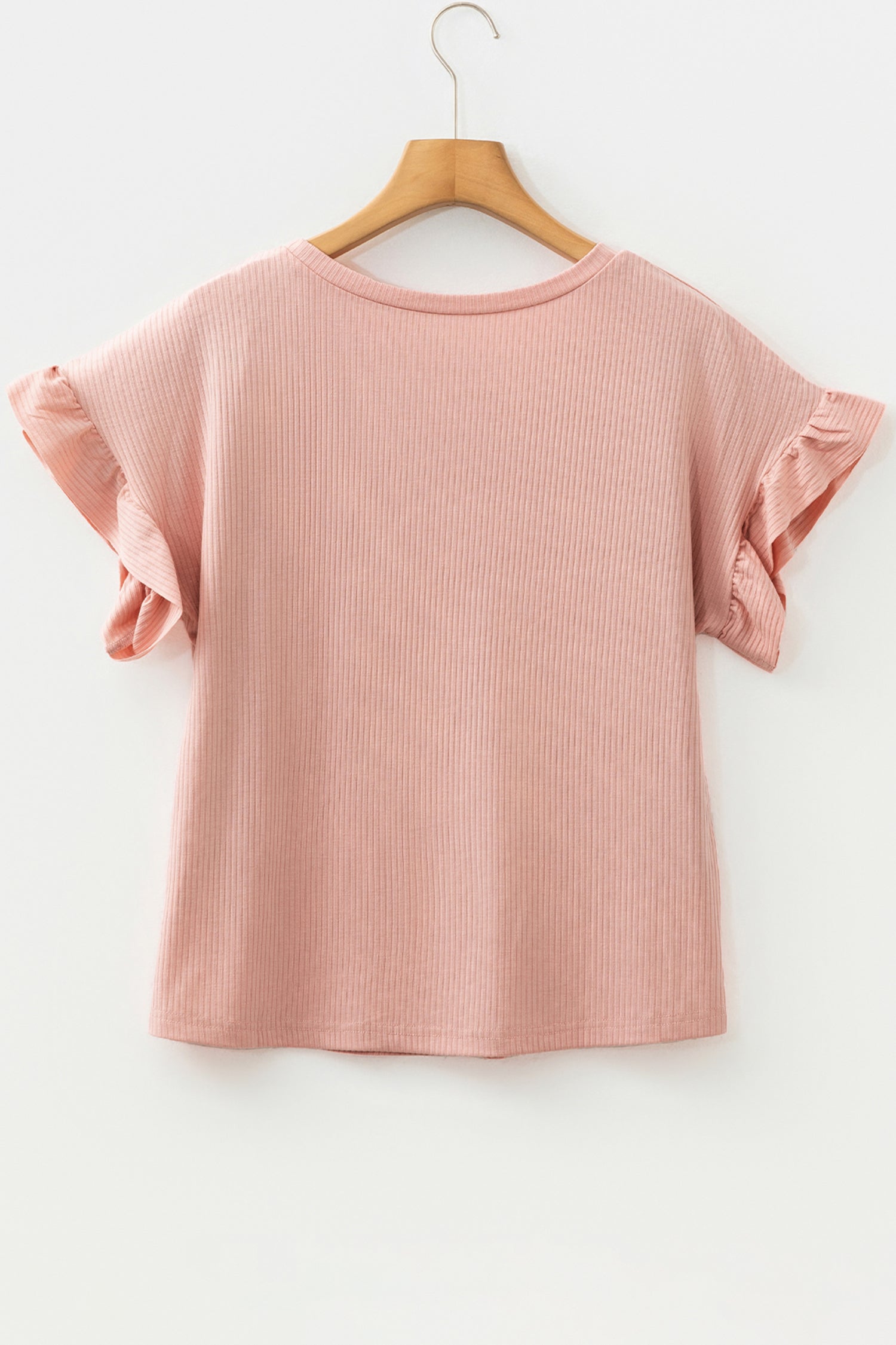 Dusty Pink Solid Color Ribbed Ruffled Short Sleeve T Shirt