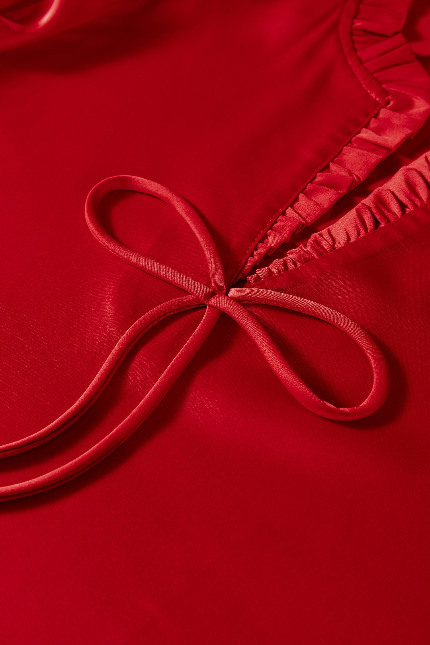 Fiery Red Solid Color Frilled V Neck Bow Detail 3/4 Sleeve Blouse