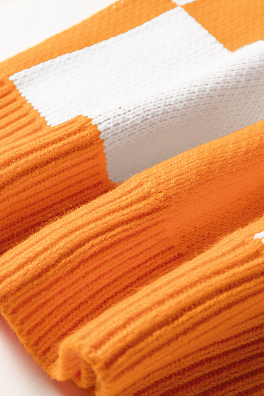 Grapefruit Orange Checkered Pattern Polo Collar Loose Sweater
