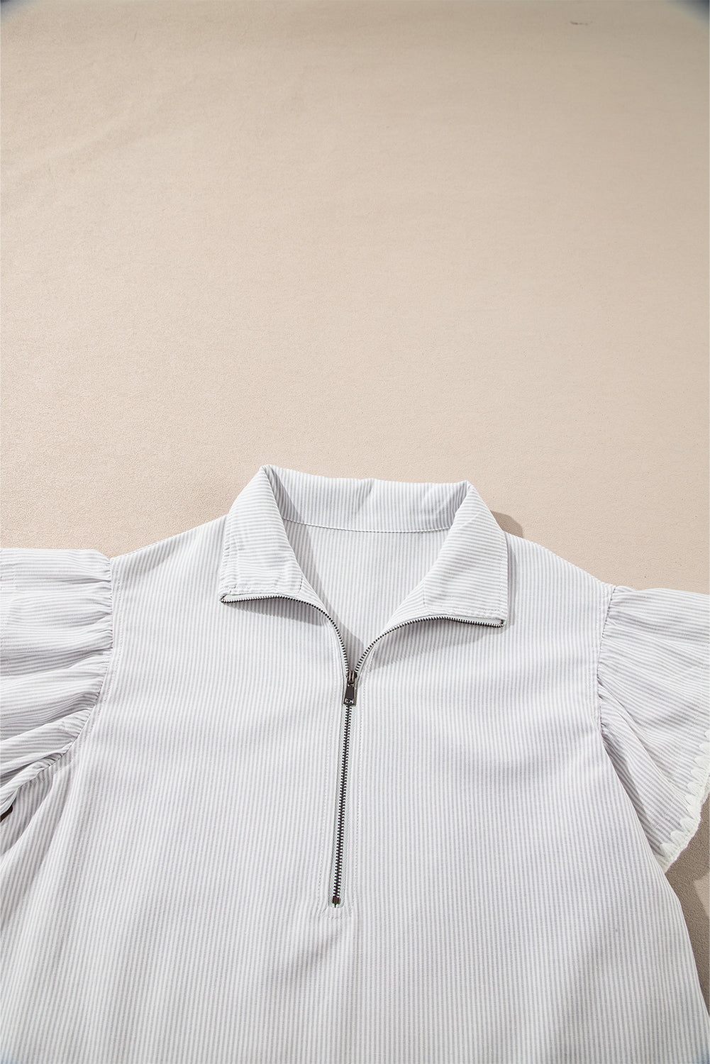 Gray Stripe Zipped up Collar Ruffled Sleeve Tee and Wide Leg Pants 2pcs Outfit