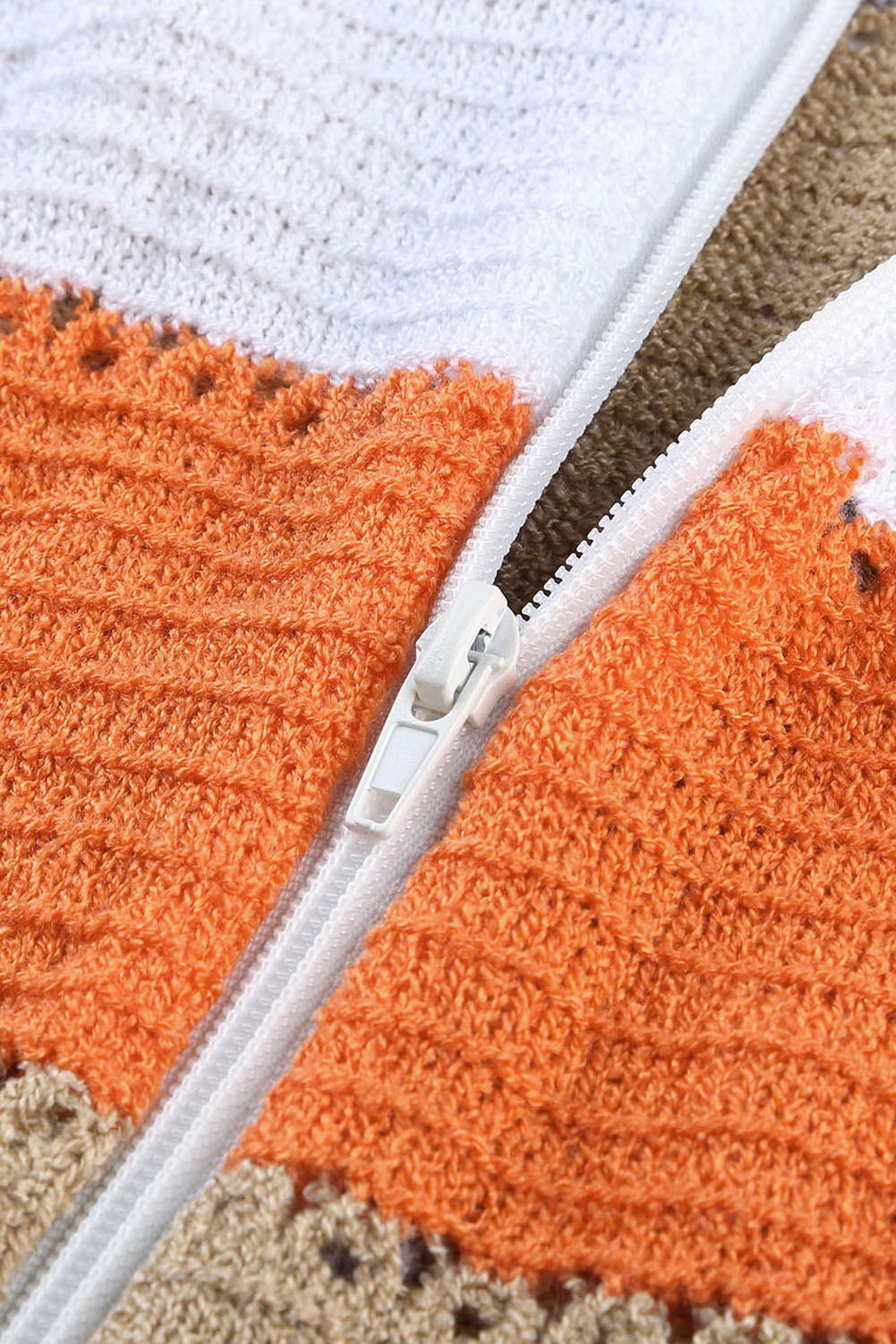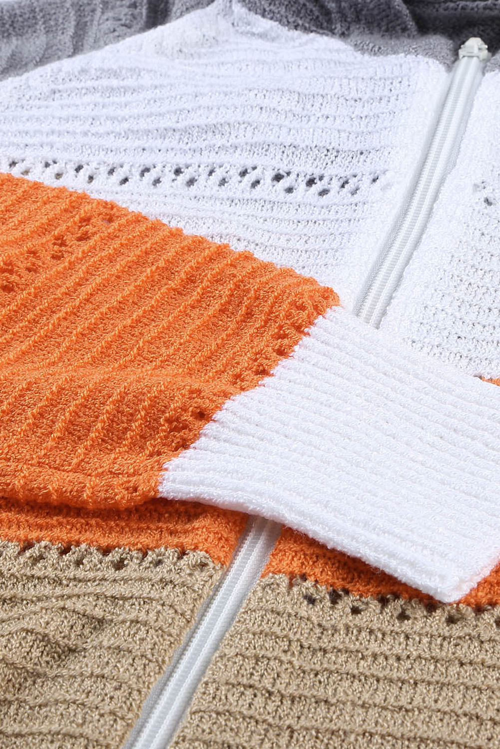 Gray Zipped Front Colorblock Hollow-out Knit Hoodie