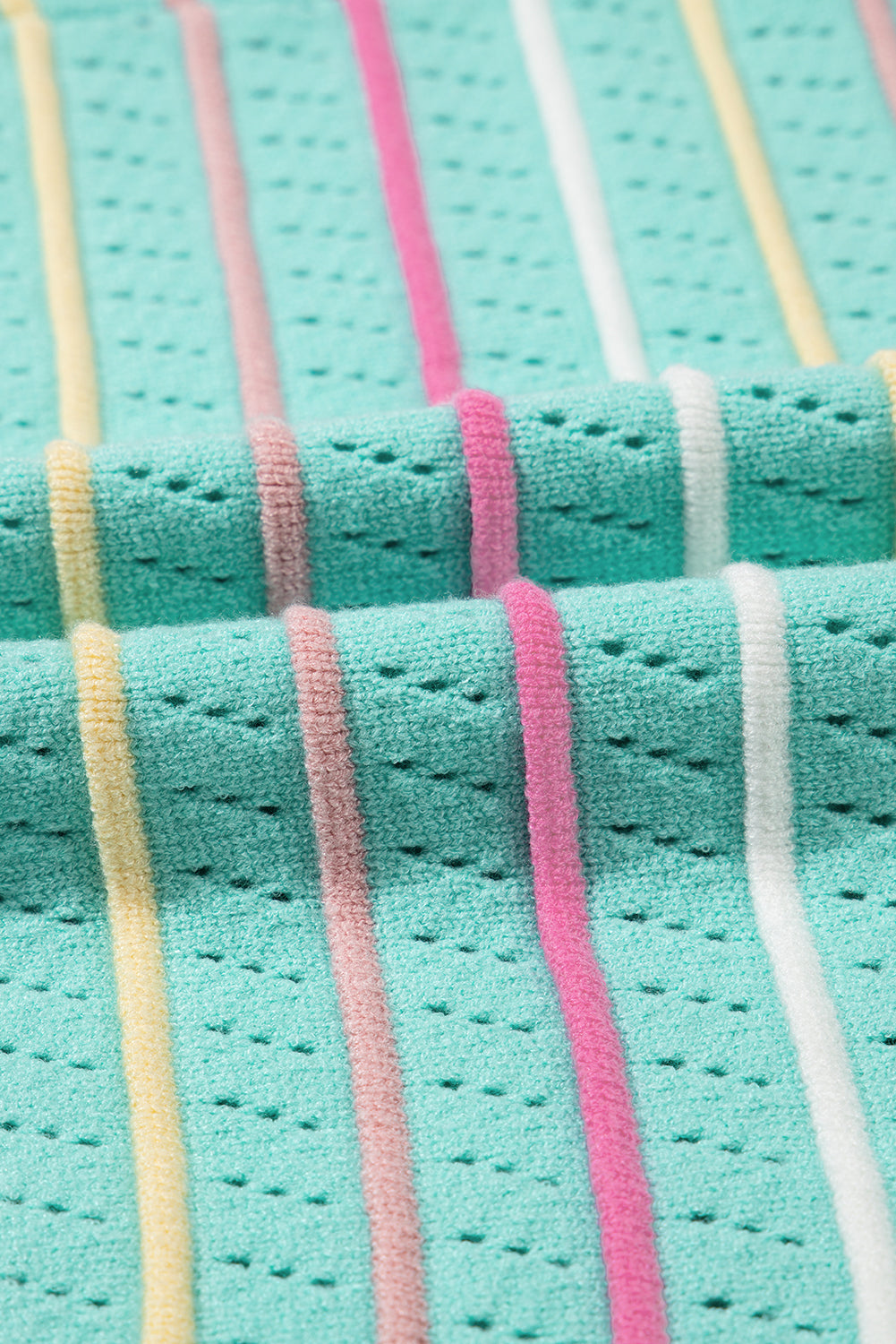 Green Colorful Striped Eyelet Knit Ruffled Sleeve Sweater T Shirt