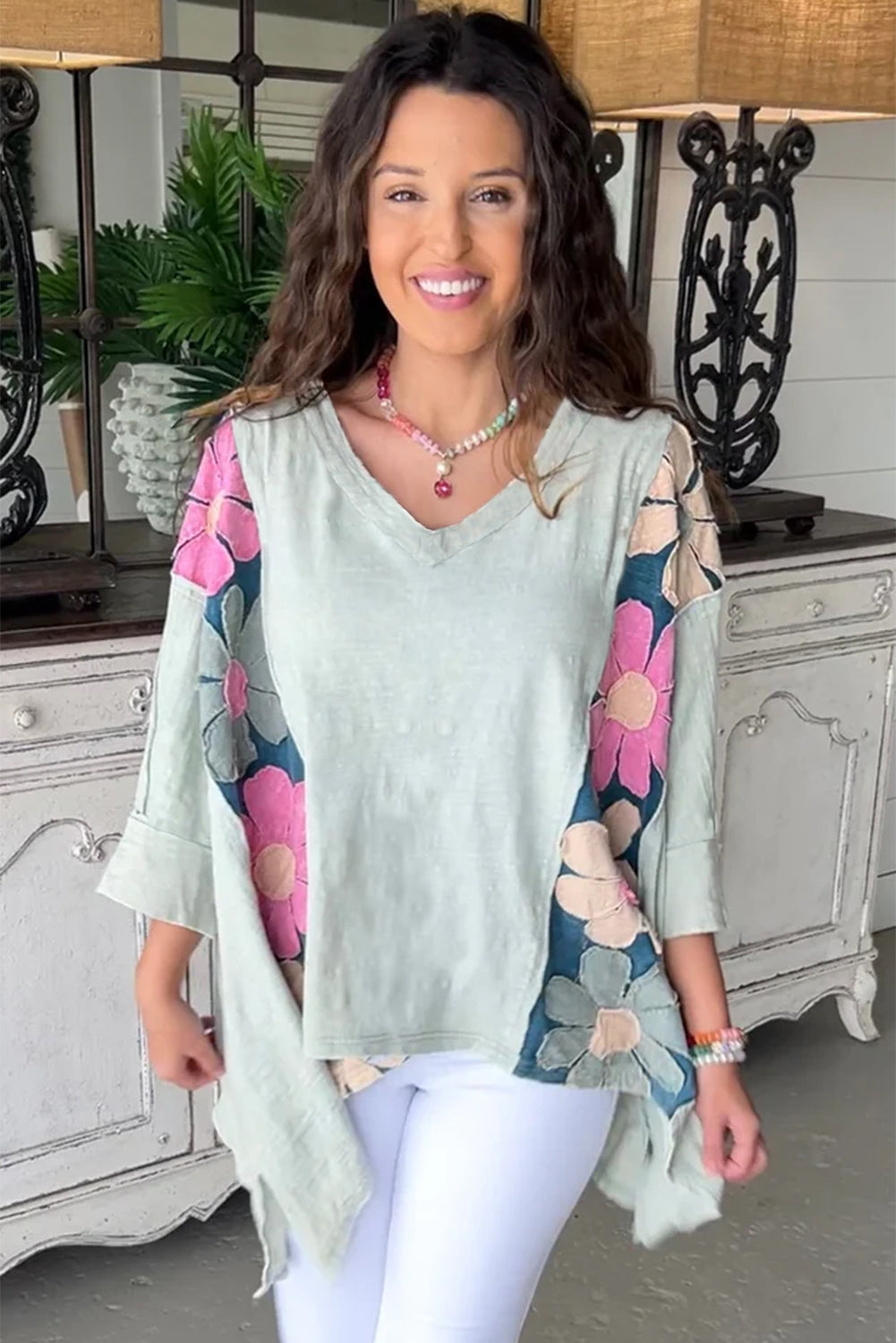 Green Flower Patchwork Exposed Seam Oversized High Low Top