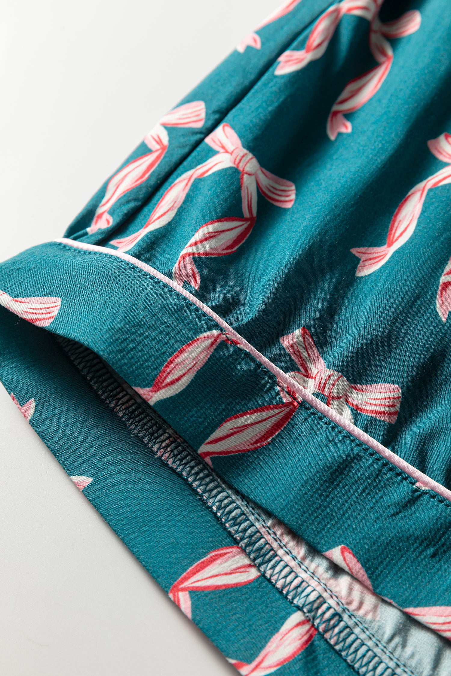 Green Ribbon Bow Print Silky Long Sleeve Shirt and Shorts 2pcs Pajama Set