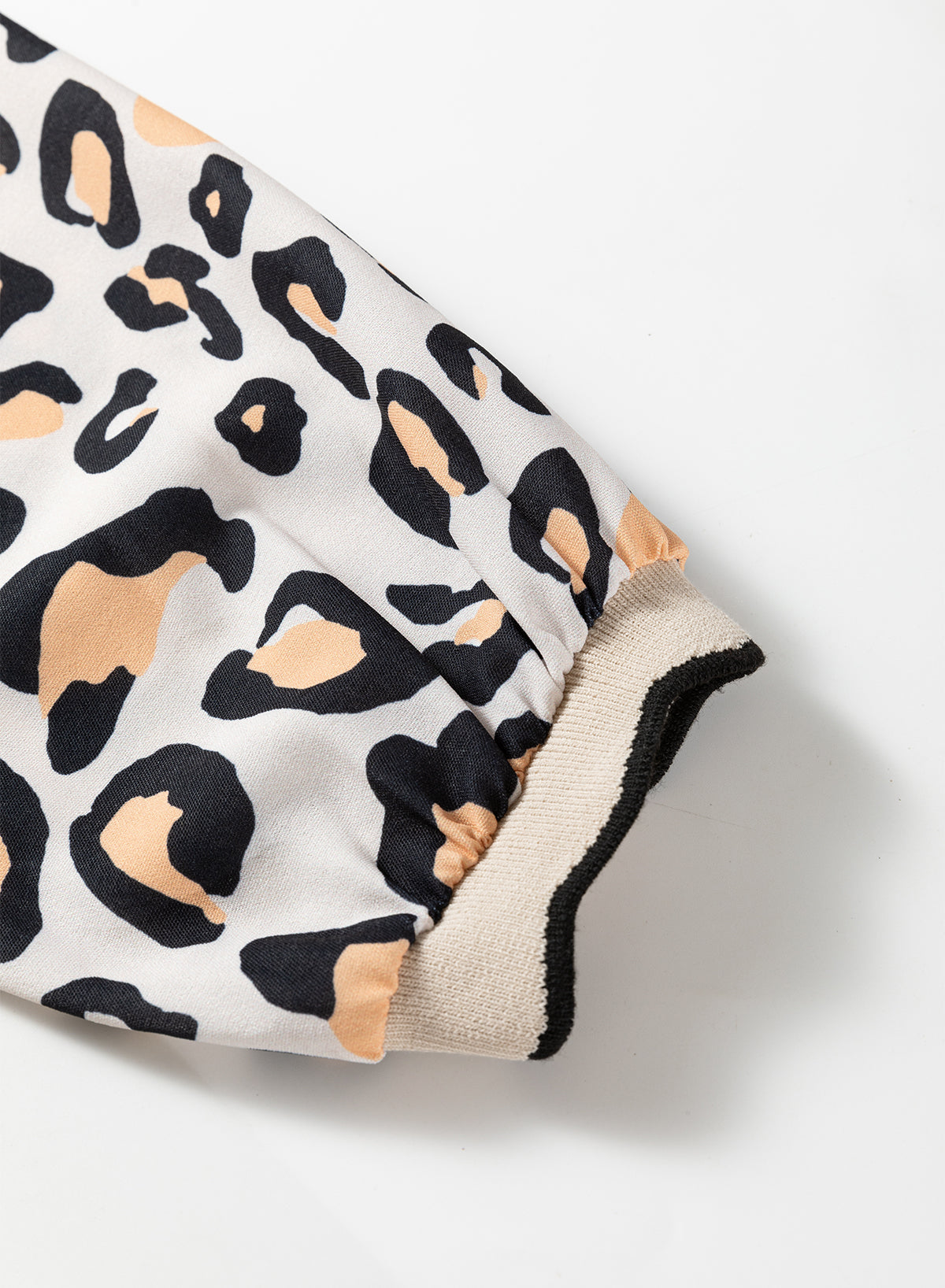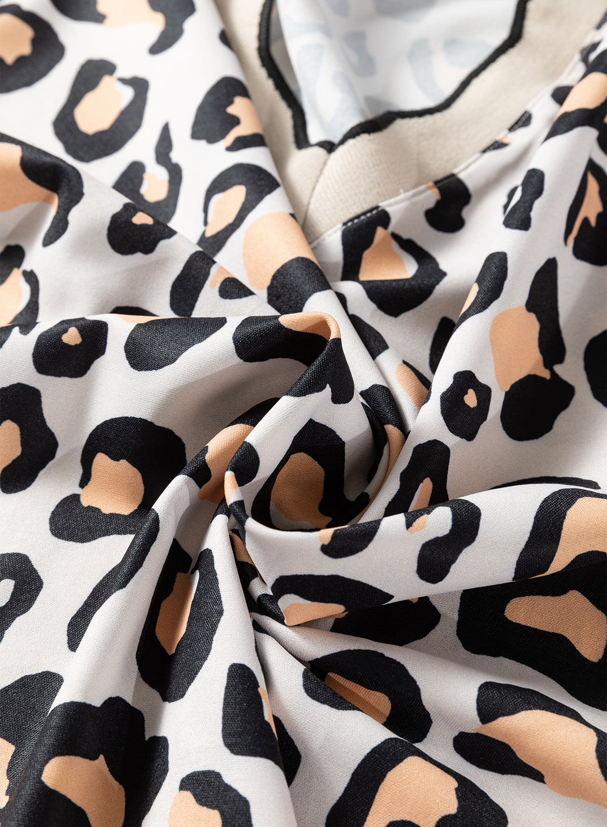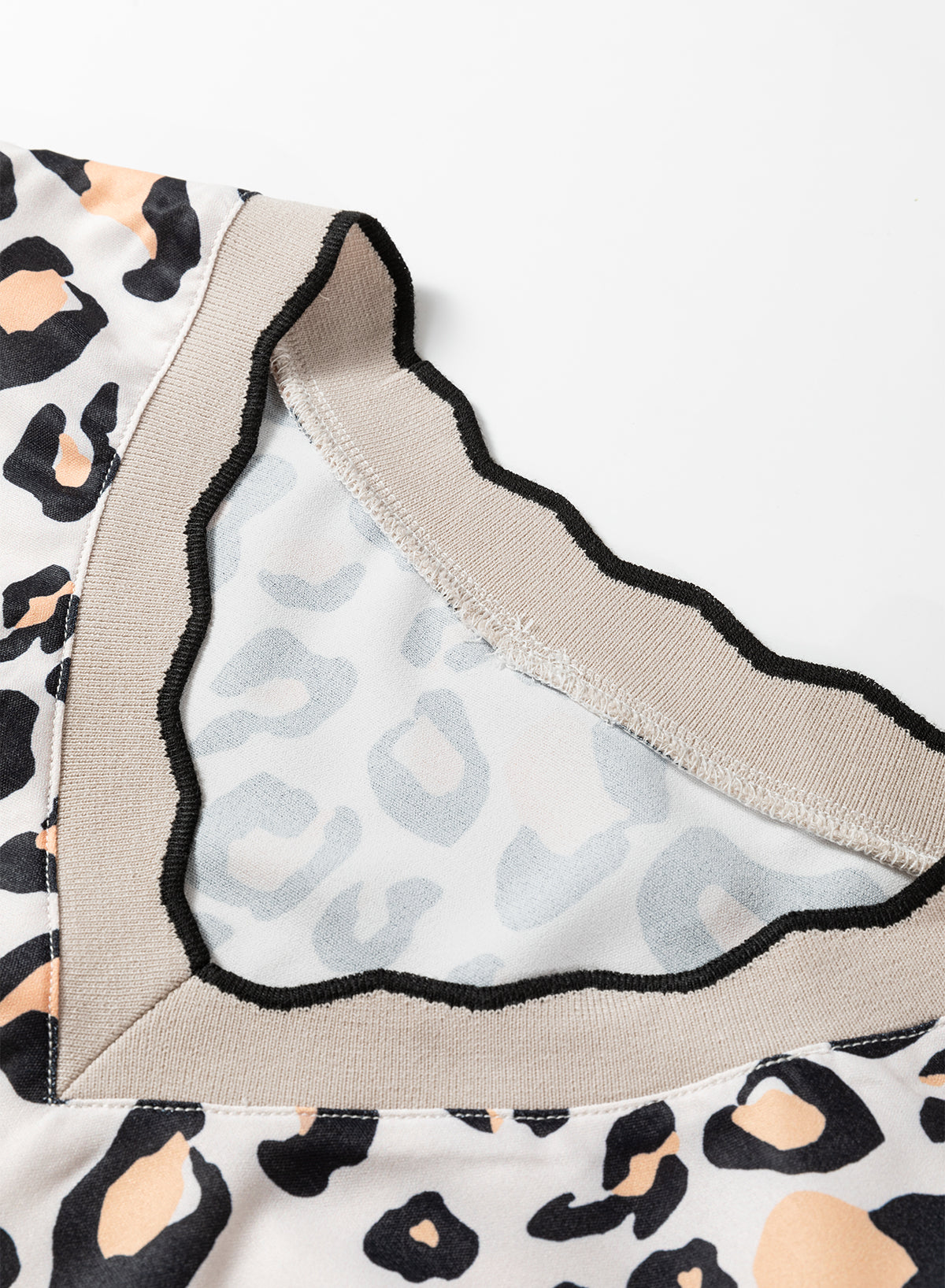 Khaki Leopard Print Contrast Scalloped V Neck Long Sleeve Blouse