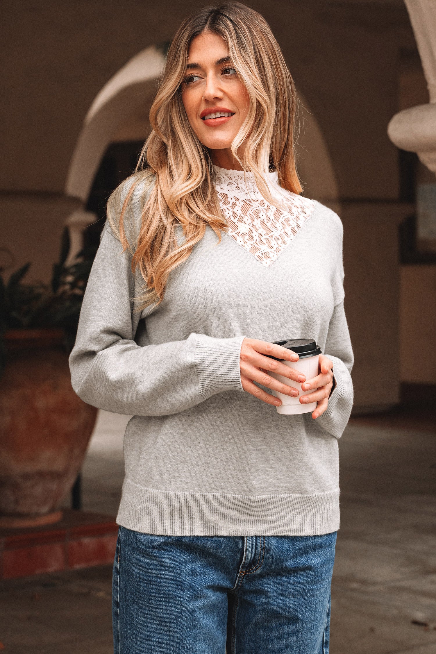 Light Grey Button Keyhole Lace Patchwork Drop Shoulder Sweater