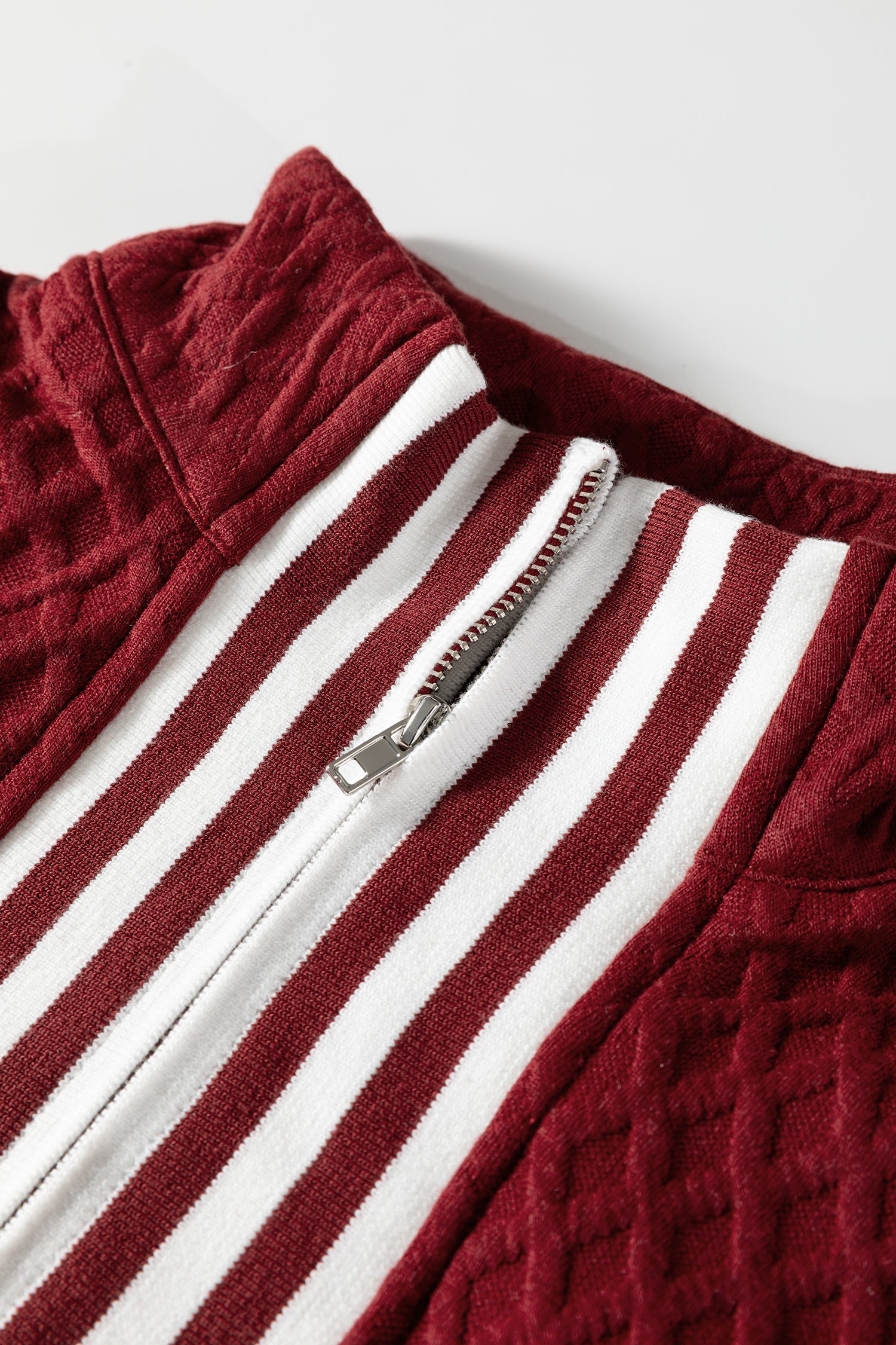 Racing Red Rhombus Textured Striped Patchwork Zip Neck Pullover Sweatshirt