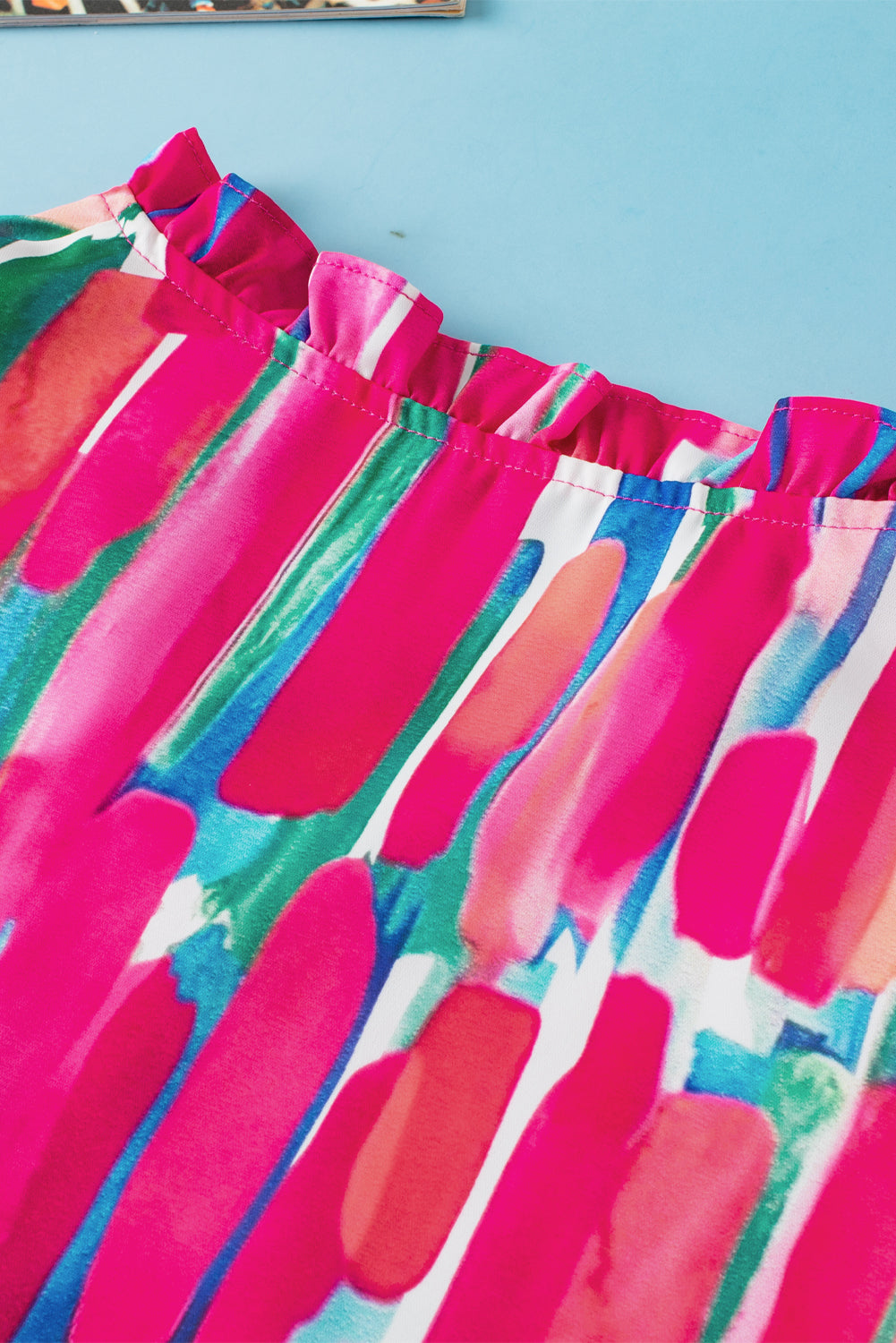 Rose Abstract Brush Print Ruffled Sleeve Frill V Neck Blouse