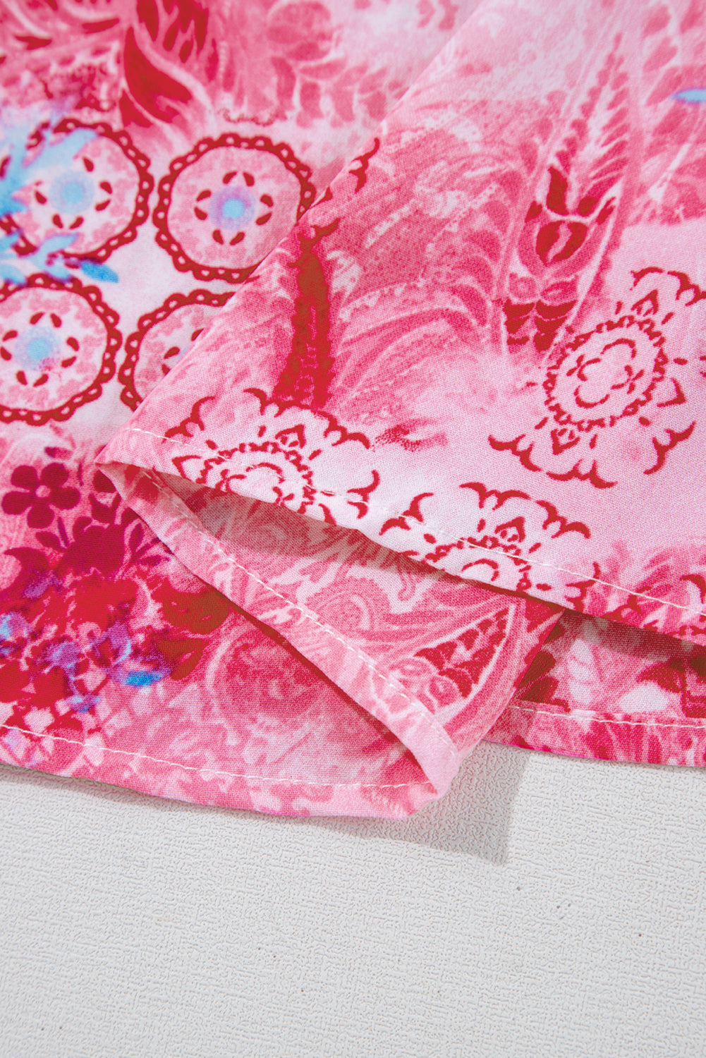 Rose Abstract Floral Print Notch V Neck Rolled Short Sleeve Blouse