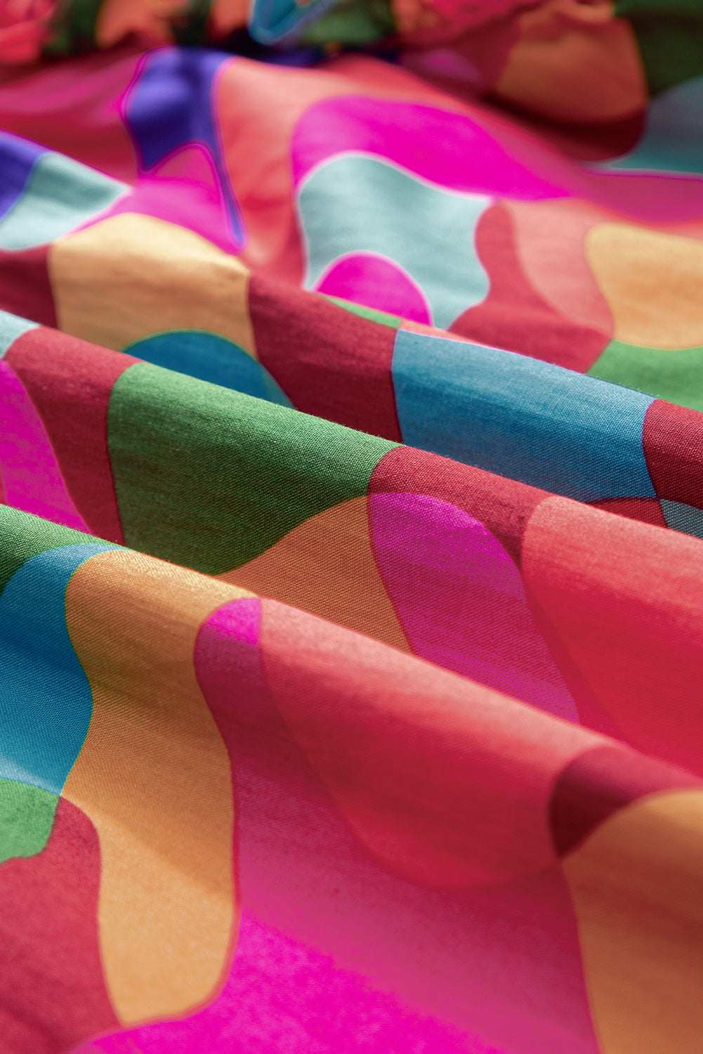 - Both the abstract print and playful ruffle sleeves are eye-catching and alluring