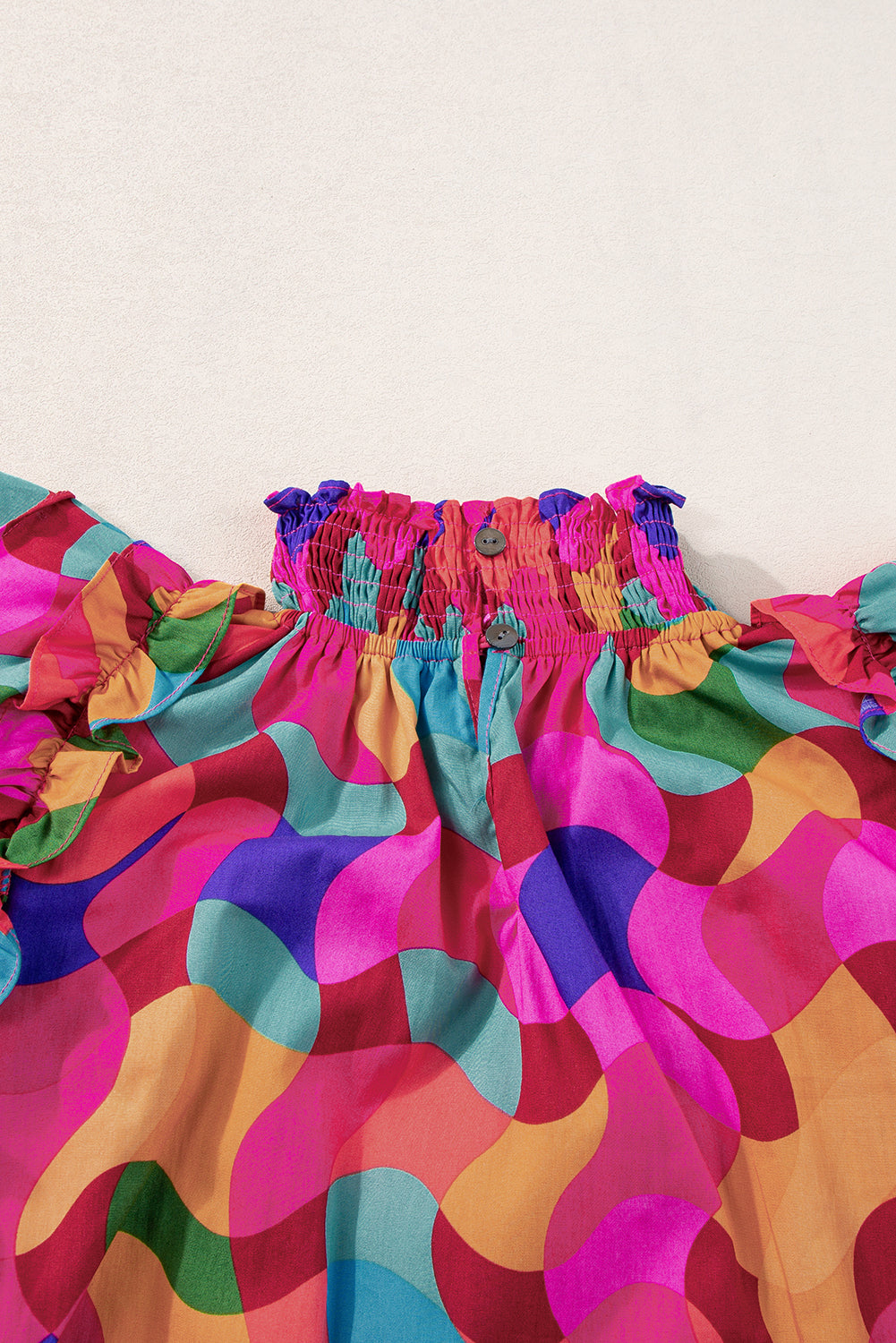 Rose Red Dramatic Ruffle Sleeve Smock Neck Wavy Print Top