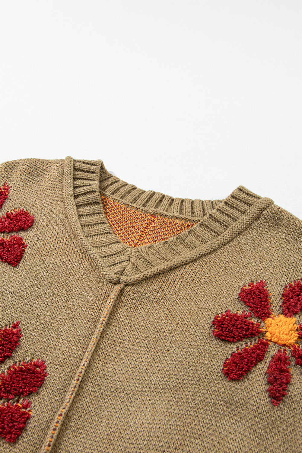Sage Green Flower Knit Ribbed Trim V Neck Sweater