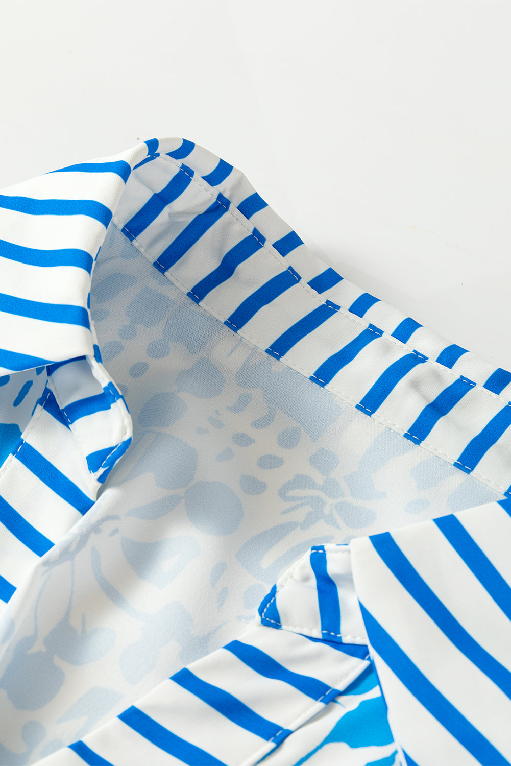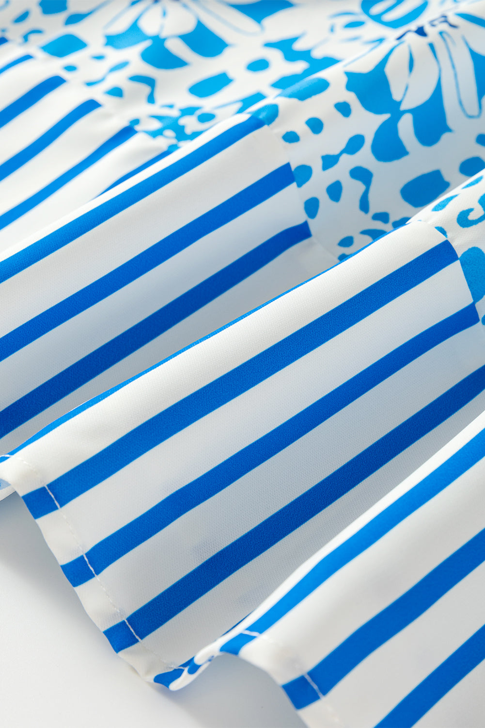 Sky Blue Contrast Striped Trim Floral Shift Fit Fall Dress