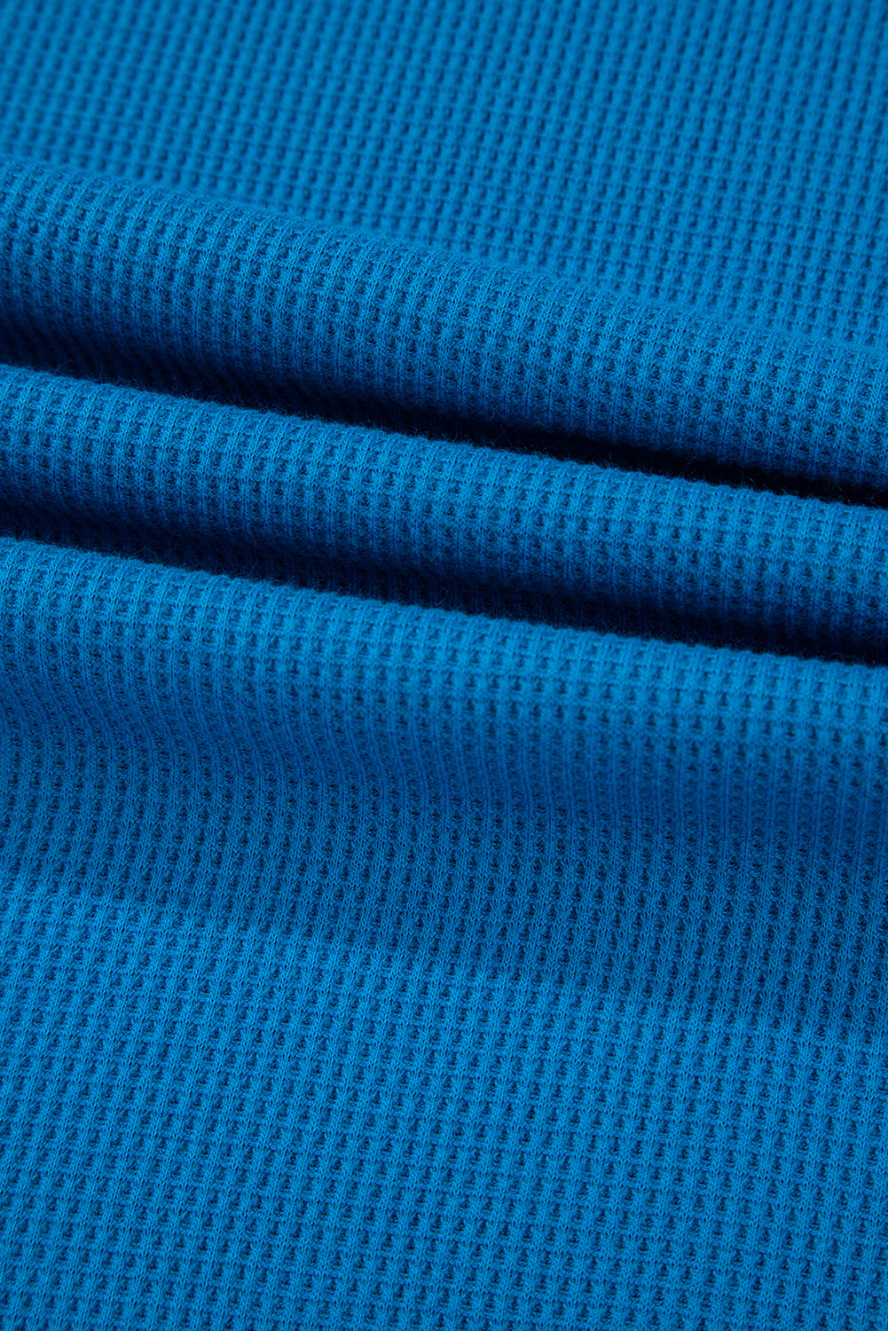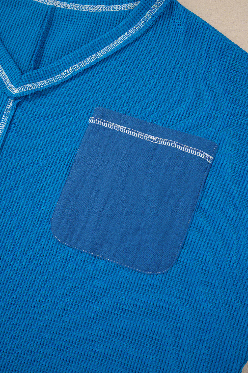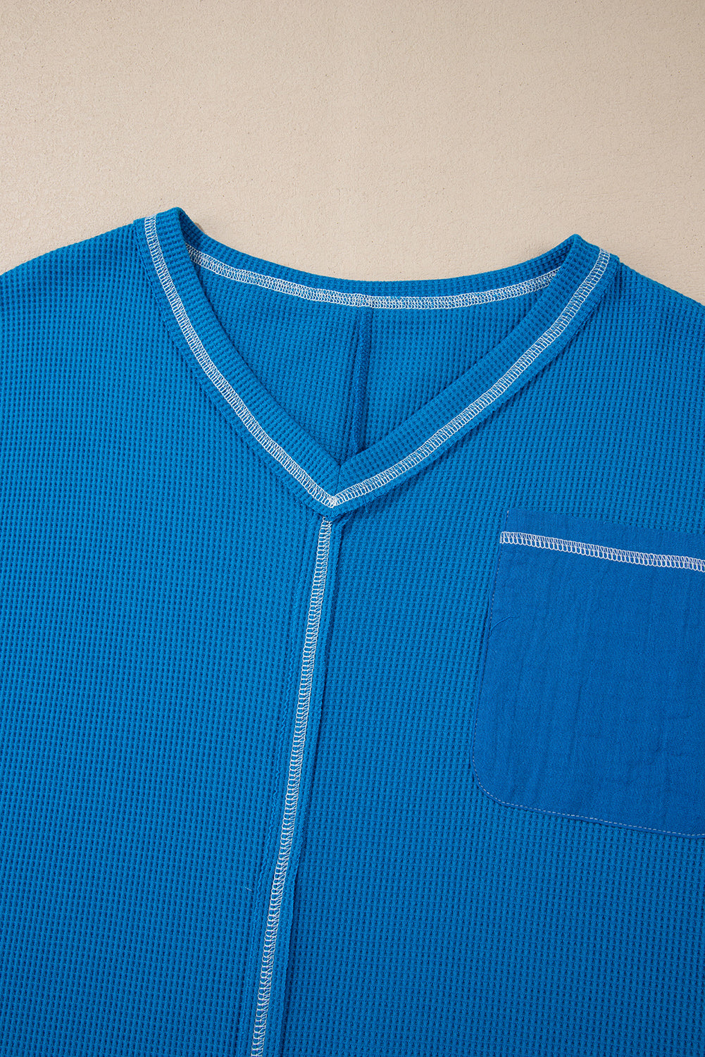 Sky Blue Lace Floral Patchwork Sleeve Stitching V Neck Rib Knit Blouse
