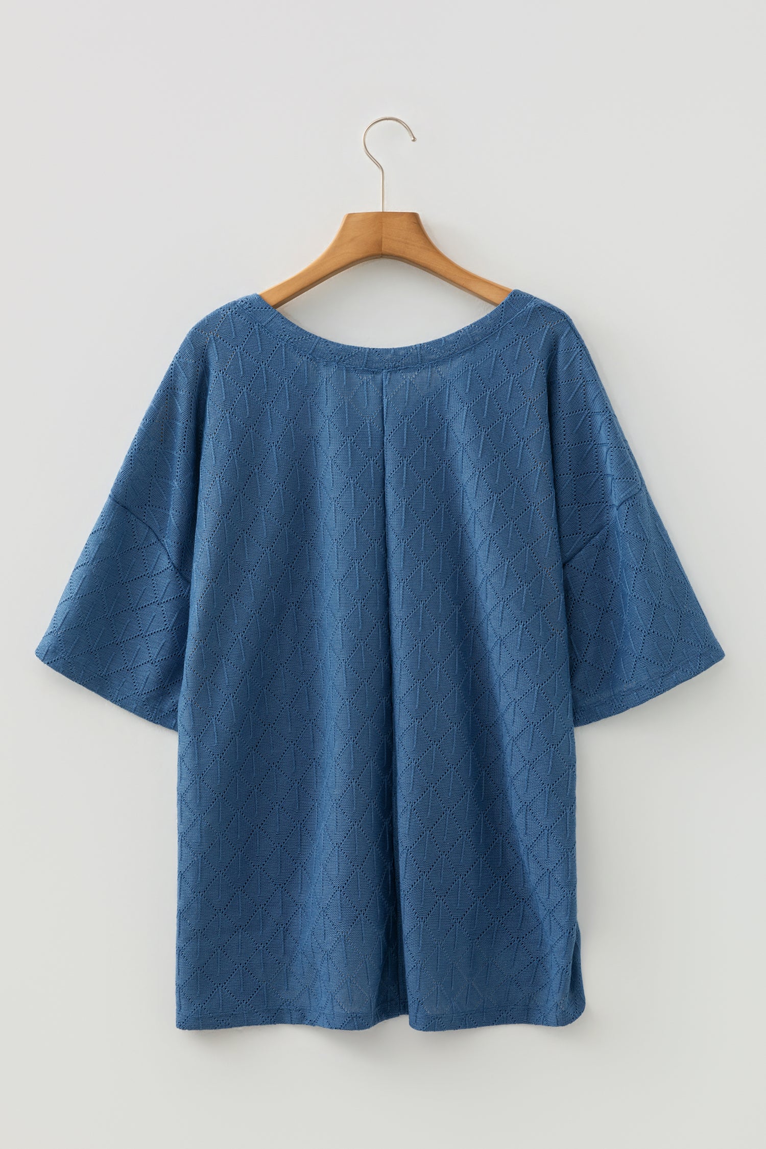 Sky Blue Pointelle Rhombus Knit Plus Size V Neck Loose Top