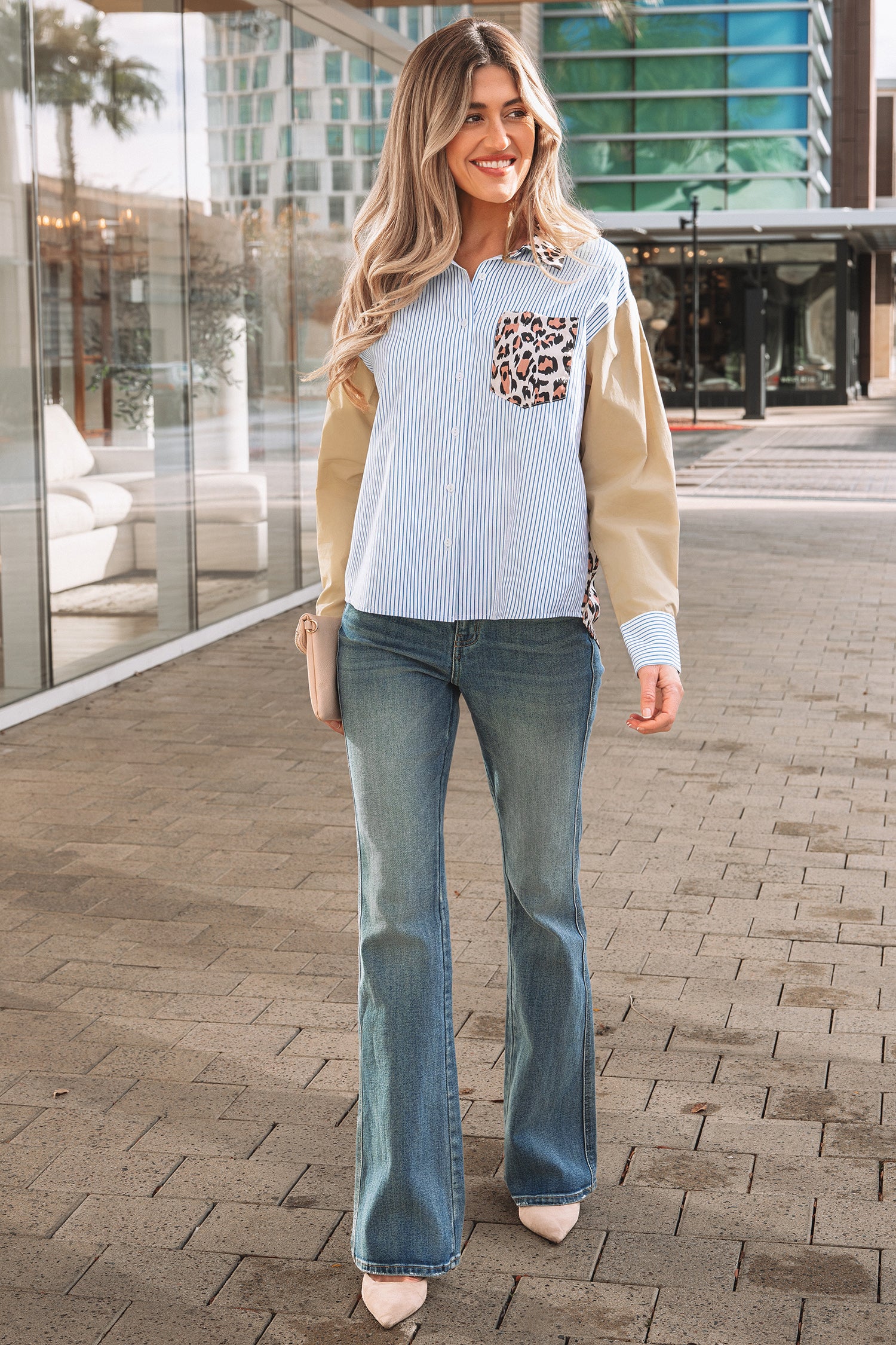 Sky Blue Stripe Colorblock Leopard Patchwork Chest Pocket Cuffed Sleeve Shirt