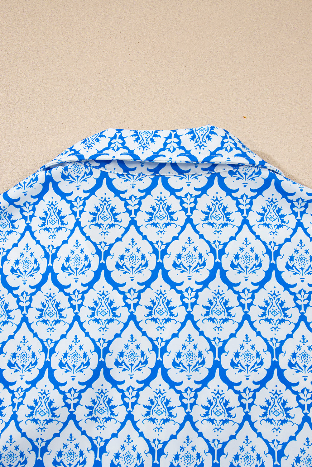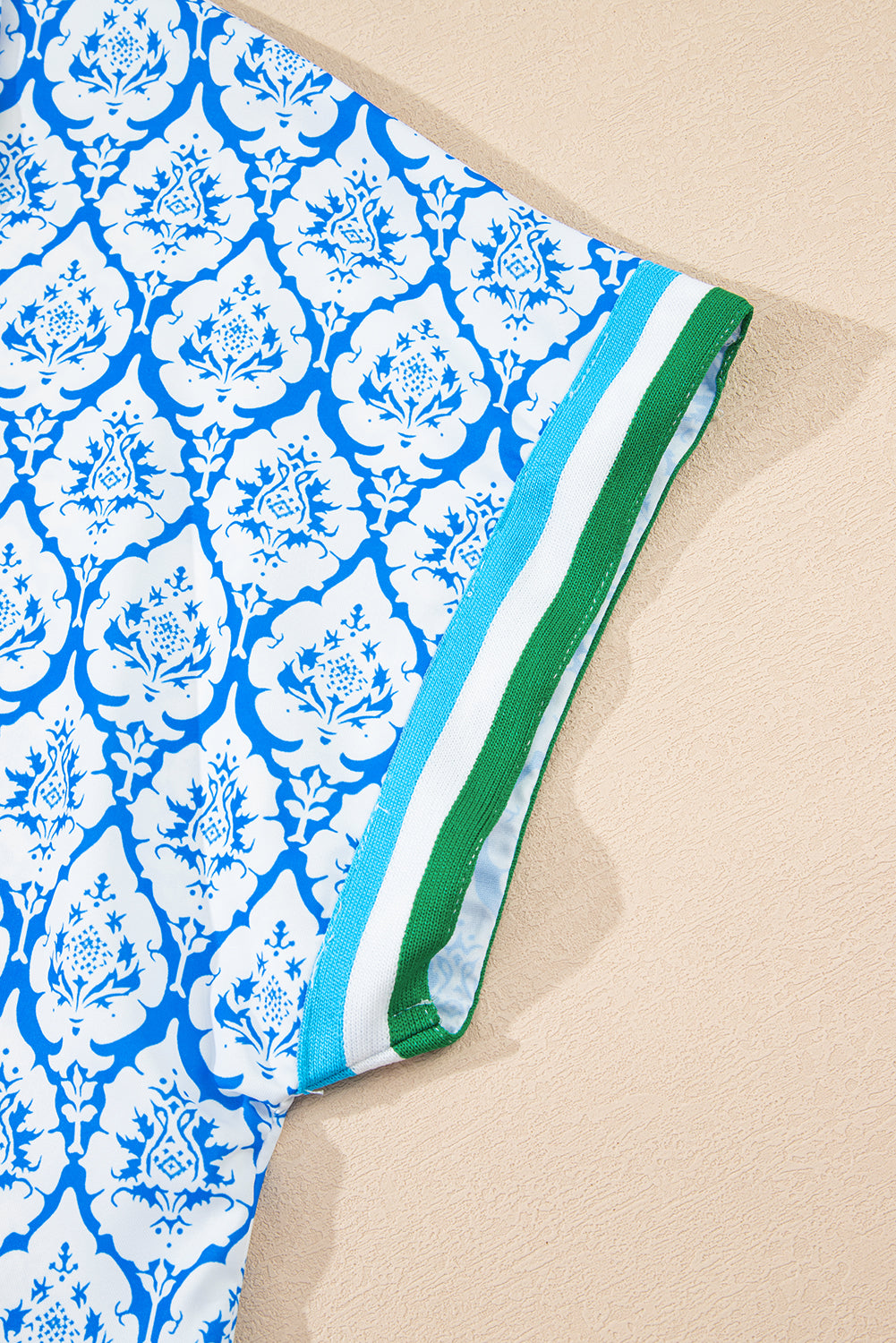 Sky Blue Western Print Zipped Collar Short Sleeve Summer Blouse Top