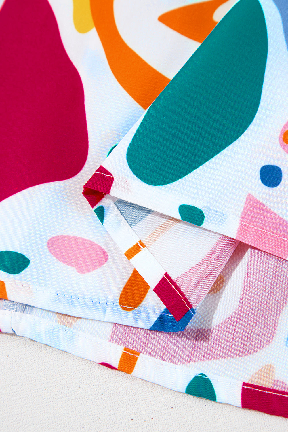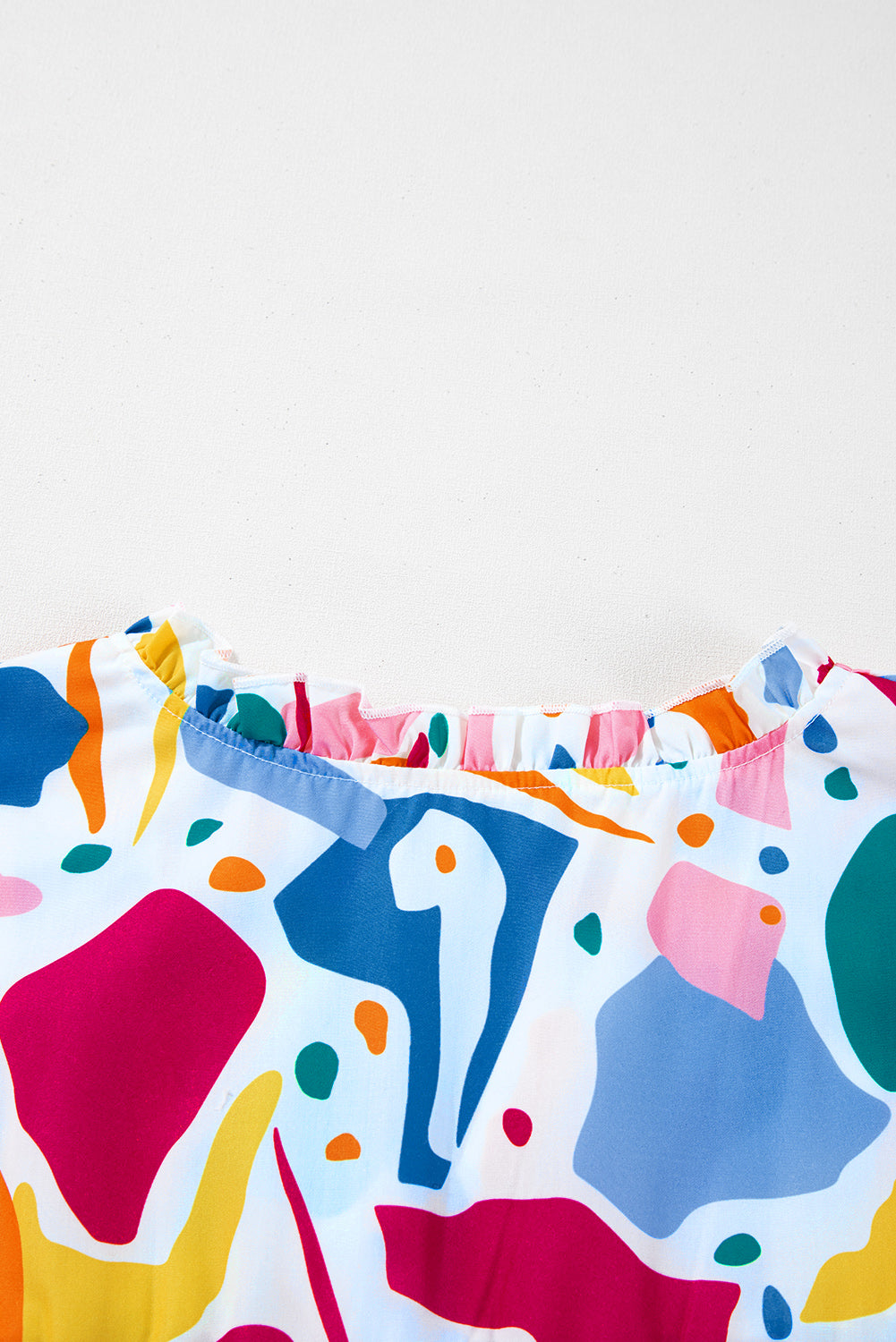 White Abstract Print Shirred Cuff Puff Sleeve Plus Size Blouse