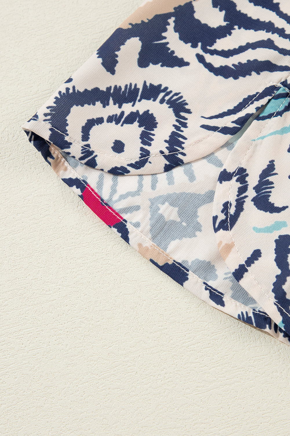 White Abstract Printed Notched V Neck Split Half Sleeve Blouse