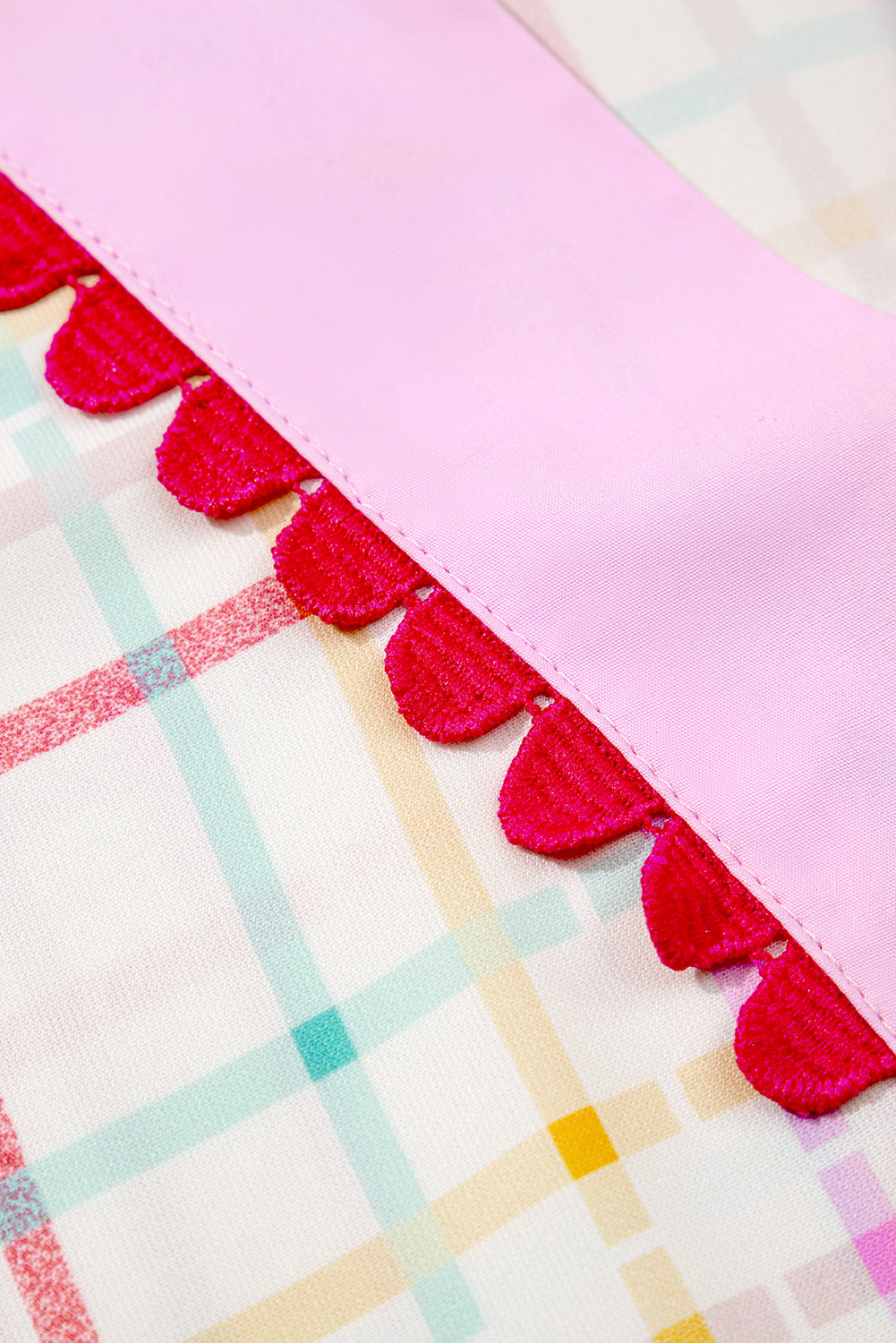 White Plaid Flutter Sleeve Colorblock Ric Rac Split V Neck Blouse